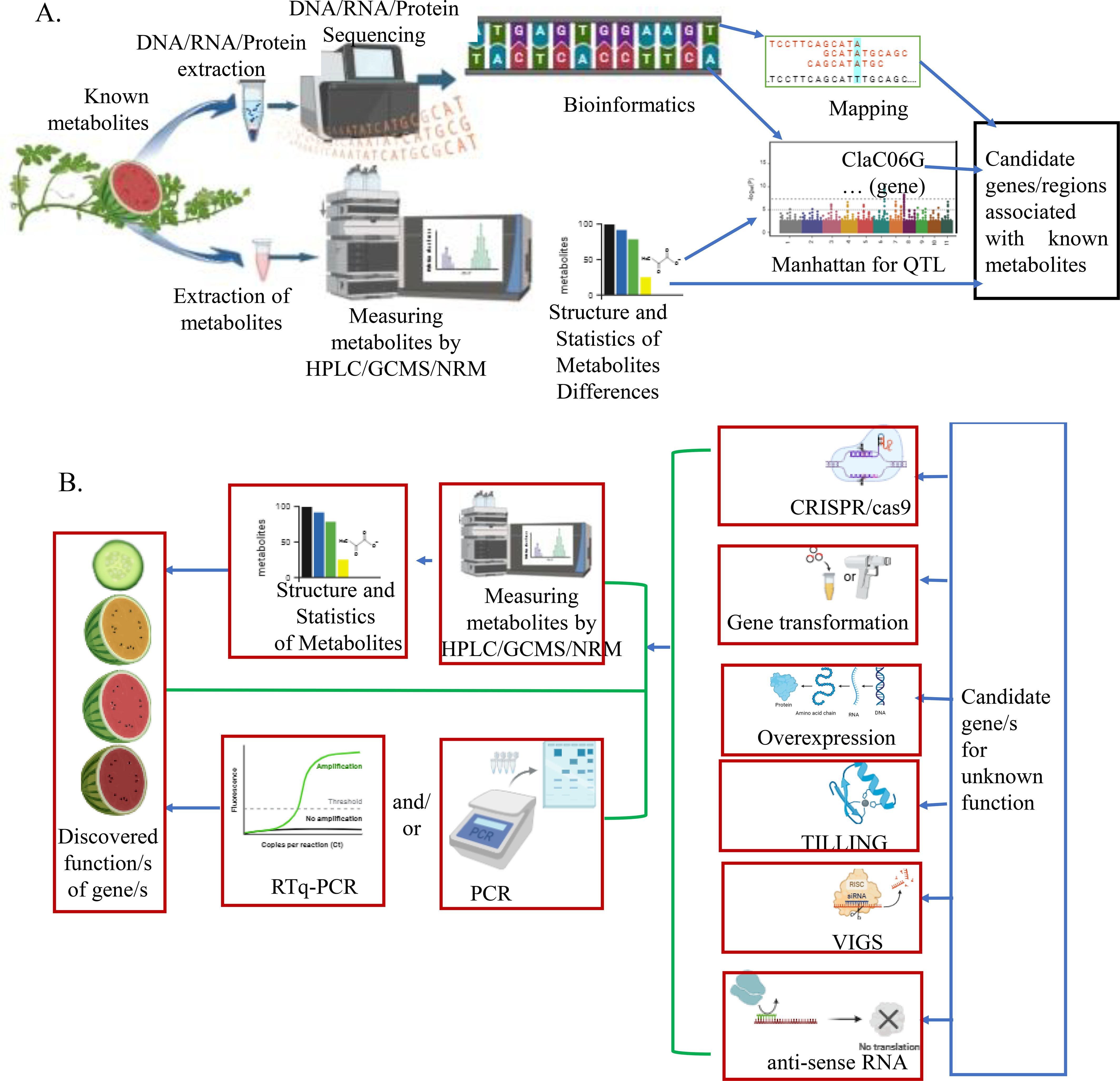 While substantial advances have been made, several key challenges persist in watermelon metabolome gene discovery and its application in breeding programs. Capturing a diverse and dynamic range of thousands of compounds requires multiple analytical platforms such as GC-MS, LC-MS, NMR, refractometers, and penetrometers, which are labor intensive, destructive, costly, and complex. Each metabolite or group of metabolites requires different sample preparation and measurement. The reproducibility and quantitative accuracy have still been hard to guarantee for comparative studies, as inconsistent annotation has been revealed. Differences in metabolite composition and their accumulation between tissues at different developmental stages have been reported in watermelon (Neglo et al., 2021), which demands layers of complex experiments to figure out causal genes. Furthermore, although thousands of metabolites have been characterized, only a few genes have been reported for some metabolites. Hence, the discovery of their pathways and genes underlying the enormous number of metabolites requires greater emphasis to exploit and utilize for breeding.
