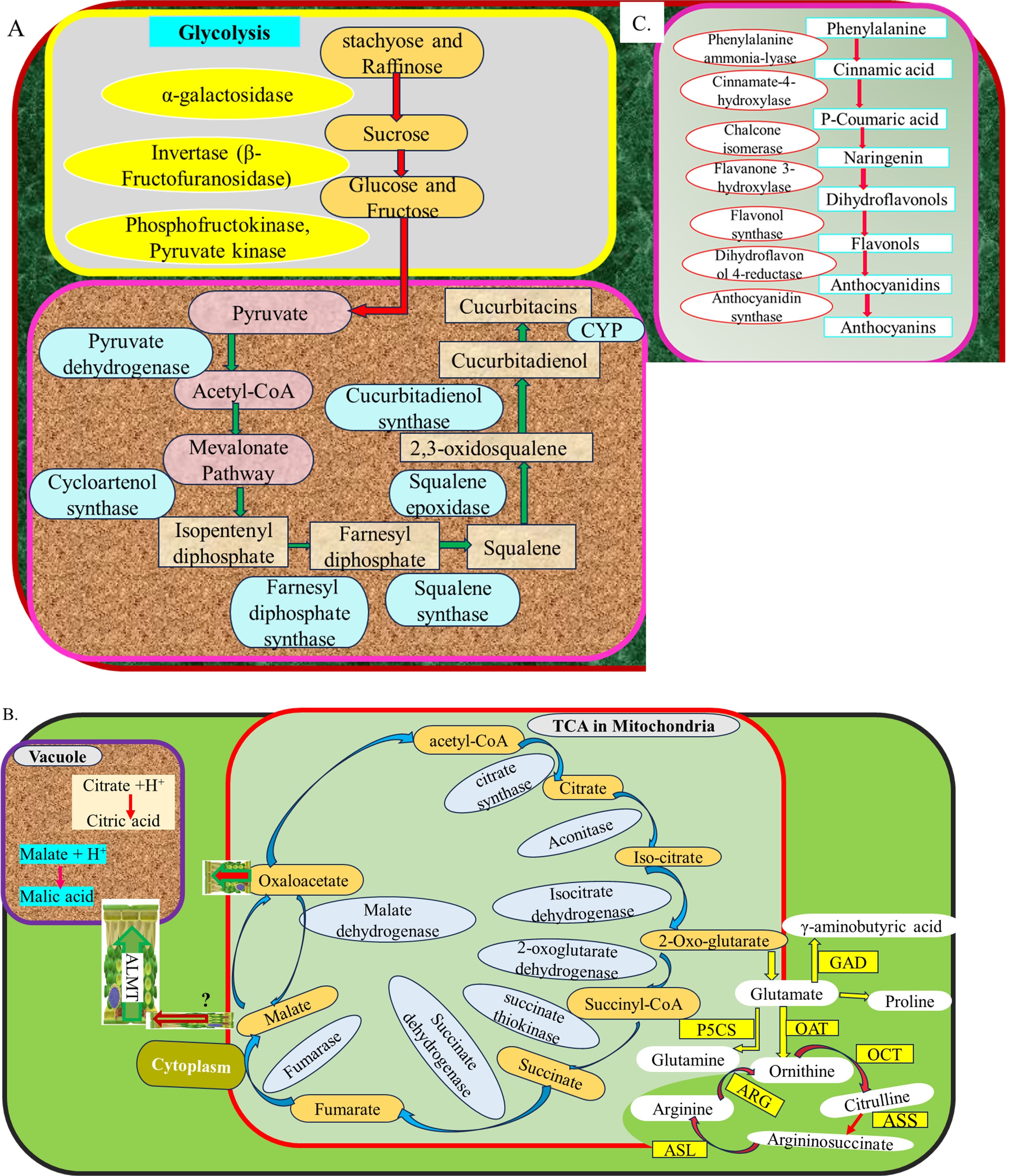 Figure 2. Genes involve in different metabolic networks in watermelon fruits (A) sugar and cucurbitacin biosynthesis (B) Organic acid and amino acid biosyntheis (C) Flavonoids biosynthesis.