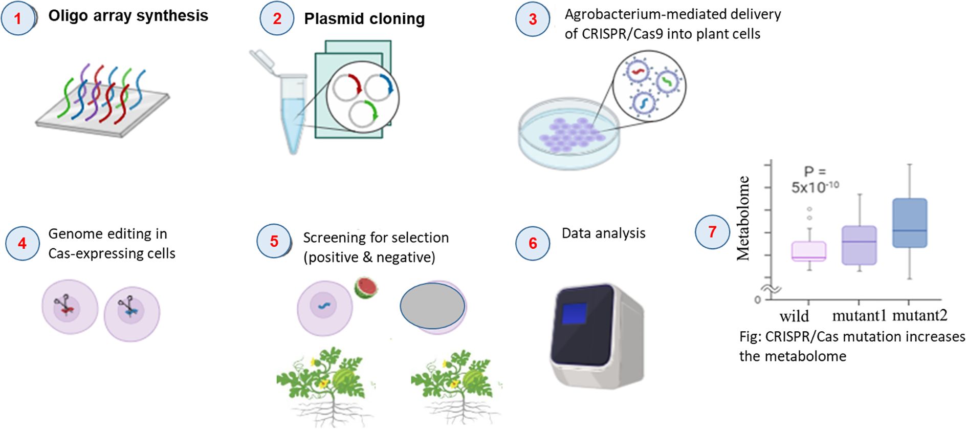 Recent advances in gene editing technologies, particularly clustered regularly interspaced short palindromic repeats-associated protein 9 (CRISPR/Cas9) systems, have commenced in the transformation of precision breeding in watermelon by enabling targeted modifications of key metabolic genes (Wang et al., 2024). Unlike conventional transgenic methods, gene editing provides a non-GMO strategy for trait improvement, making it particularly valuable for markets with strict biotechnology regulations (Lemmon et al., 2018). The technique’s precision in editing specific nucleotide sequences without introducing foreign DNA addresses major consumer concerns about genetically modified organisms (Tsakirpaloglou et al., 2023). As regulatory frameworks worldwide increasingly recognize the distinction between gene-edited and transgenic crops, these technologies are emerging as powerful tools for developing improved watermelon metabolites. Knock-in, knockdown, and knockout of genes are three distinct CRISPR/Cas9 mechanisms to alter the function of the genes. The model of general steps is indicated in Figure 3. Even though knockout has been emerging, it has been prominently featured in watermelon fruit metabolome research when compared with knockdown and knockin, which has not yet been employed to manipulate these traits. For instance, knockout of phosphoenolpyruvate carboxykinase (PEPCK), an organic acid-synthesizing gene, has reduced the acidity of watermelon fruits by hindering the function of this gene (Yang et al., 2025). The ClIAA16 mutant, which has been developed through knockout, has exhibited premature termination of protein translation due to one base pair insertion, which has shown delayed watermelon fruit ripening. This mutation may contribute to extended shelf life, though it has reduced the fruit sugar content (Hu et al., 2023). Similarly, two ClVST1 mutants of the ZZJM watermelon cultivar, with 5 and 1 nucleotide deletions, have been developed through the knockout approach and have revealed reduced sugar contents (Ren et al., 2021). These examples indicate promising potential of this breakthrough approach, which allows precise regulation of gene function to reduce undesirable traits through knockout and to enhance desirable characteristics such as sweetness and flesh color through knock-in of sugar metabolism genes (e.g., SPS, SuSy, fructokinase) and modulation of pigmentation via lycopene biosynthesis genes such as ClPSY1 in watermelon fruit. By combining gene editing with traditional breeding methods, researchers can accelerate the creation of varieties with optimized metabolomes that can improve fruit metabolite profiles and enhance nutritional contents, positioning this technology as a cornerstone of future watermelon improvement programs. Still, this approach is very infantile and requires more attention for the improvement of watermelon fruit metabolites that pertain to fruit quality.