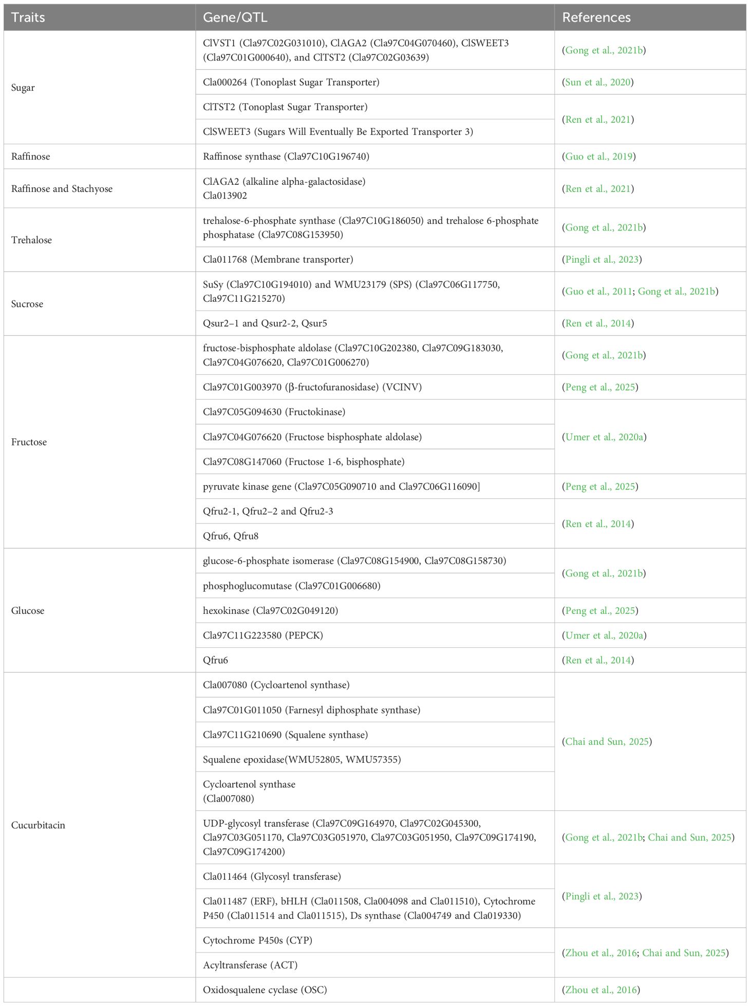Cucurbitacins, bitter-tasting compounds prevalent in wild watermelons, are mostly absent in cultivated varieties (Zhou et al., 2016). Deciphering the genes responsible for cucurbitacin biosynthesis and regulation is crucial for breeding efforts and enhancing fruit quality. Recent studies have uncovered critical genes and regulatory mechanisms that govern cucurbitacin production in watermelon fruit. Cucurbitacin biosynthesis in watermelon has been regulated by a coordinated network of structural genes, modifying enzymes, and transcriptional regulators. Key genes, such as the CGC1 cluster, cytochrome P450s, cucurbitadienol synthase, and various transferases, play central roles in the production and diversification of cucurbitacins (Zhou et al., 2016; Chai and Sun, 2025) as illustrated in Figure 2C. It was indicated from pyruvate to cucurbitacin in this figure. Fine mapping of F2 population of watermelon that has been developed from two inbred lines, “9904” (bitter flesh) and “Handel” (non-bitter flesh), with the parents, has enabled the uncovering of the locus of four candidate genes (Cla011507, Cla011508, Cla011509, and Cla011510) that synthesize watermelon fruit cucurbitacin (Gong et al., 2022). Pingli et al. (2023) have carried out genome-wide analysis and reported 42 watermelon fruit cucurbitacins with 8 major loci. Especially cytochrome P450s genes create diversity of cucurbitacins (Zhou et al., 2016). Through a biosynthesis of cucurbitacins, cucurbitadienol, which is the triterpenoid, has been utilized as a substrate for the production of cucurbitacins. It has been synthesized from 2,3-oxidosqualene by an oxidosqualene cyclase gene (Davidovich-Rikanati et al., 2015). Transcription factors of oxidosqualene cyclase (OSC), ACT, and CYP genes have also demonstrated high production of cucurbitacin in wild watermelon, while it has not been revealed in domesticated watermelon (Zhou et al., 2016). Similarly, SNP change in the transcription factor binding site (GCC-box) in promoter regions of cultivated watermelon has banned the production of cucurbitacins (Pingli et al., 2023). Furthermore, these authors reported the insertion of 244 amino acids in the CDS region of Cla019330 (ClOSC) in cultivated watermelon, while that insertion has been absent in wild watermelon and resulted in the absence of cucurbitacin production. This is deciphered as domestication has led to reduced expression and accumulation of these bitter compounds. The other reported genes have been revealed in the following Table 1. These genes need further validation and implementation for molecular breeding.