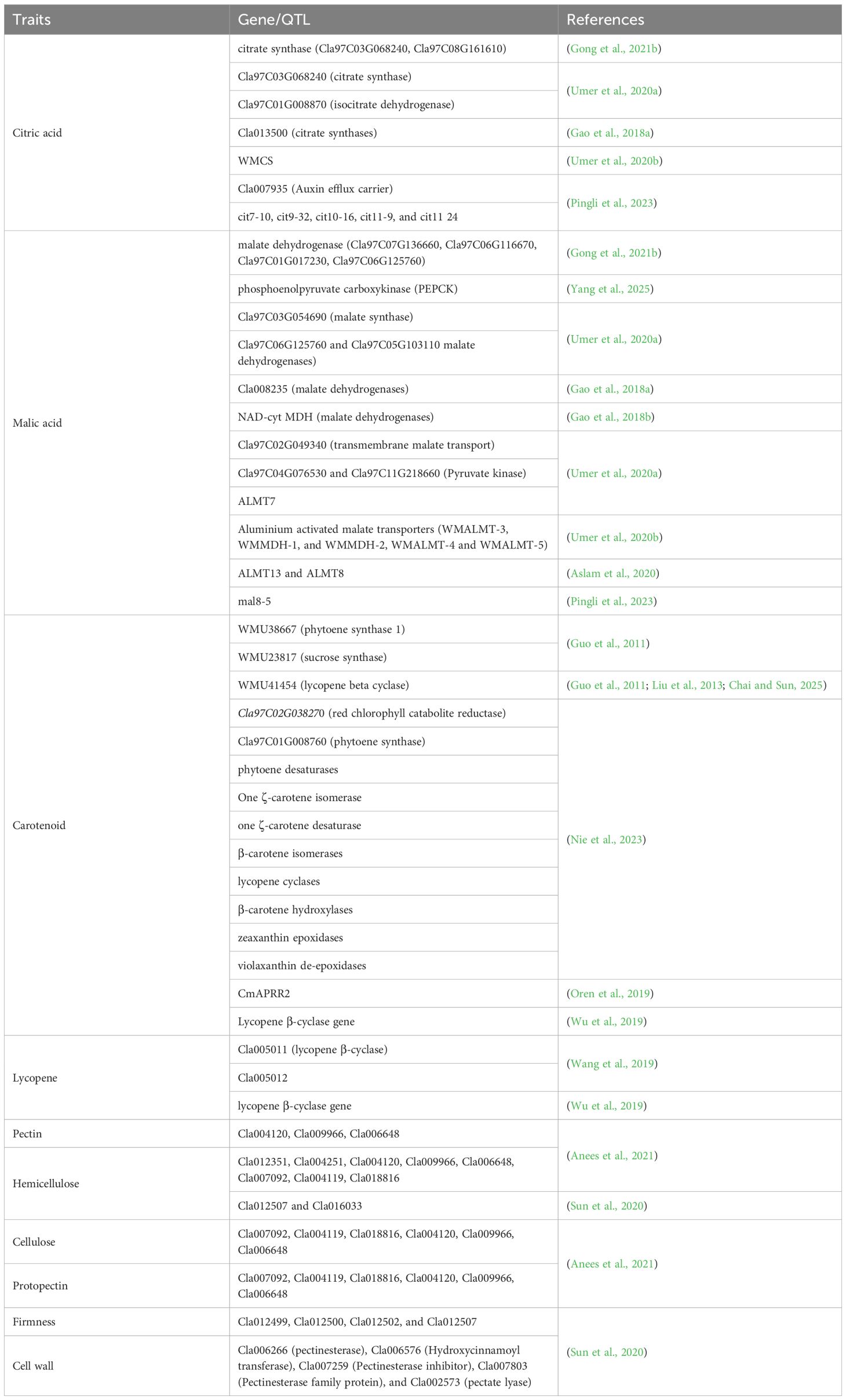 By integrating metabolomics data with genomic tools such as quantitative trait locus (QTL) mapping and genome-wide association studies (GWAS), researchers have pinpointed specific genes responsible for desirable metabolic traits (Wang et al., 2021a; Liang et al., 2022; Zhan et al., 2023). Furthermore, these approaches have been used to reveal regulatory networks (Ren et al., 2014; Katuuramu et al., 2023; Vallarino et al., 2023). This systems-level understanding enables breeders to target metabolic pathways more effectively in the selection process. Similarly, the integration of other omics, such as transcriptomics and proteomics, with metabolomics has revolutionized gene discovery (Abdullah-Zawawi et al., 2022; Depuydt et al., 2022; Habibi et al., 2024; Shiratake and Suzuki, 2016). Transcriptomics provides insights into gene expression patterns during fruit development and ripening, while metabolomics quantifies the levels of various metabolites (Umer et al., 2020b; Gong et al., 2021a). The correlation between gene expression and quantified metabolite level has identified candidate genes that have been either upregulated or downregulated to alter the metabolite accumulation. For instance, upregulation of Cla97C03G064990 (sucrose synthase) and Cla97C03G068240 (citrate synthase) has been highly correlated with the accumulation of sucrose and citric acid, respectively, in watermelon fruit flesh (Umer et al., 2020b; Peng et al., 2025). Cla018406 (a chaperone protein, DNAJ-like protein) and Cla007686 (a zinc finger CCCH domain-containing protein) transcripts have been highly expressed in yellow- and red-fleshed watermelon, revealing high β-carotene and lycopene accumulation (Wang et al., 2021a; Yuan et al., 2021b). Systems biology approaches further enhance the understanding of the complex interactions between genes and metabolites, paving the way for more targeted breeding strategies. The use of multi-omics data thus represents a powerful approach for unraveling the molecular basis of the fruit metabolome.