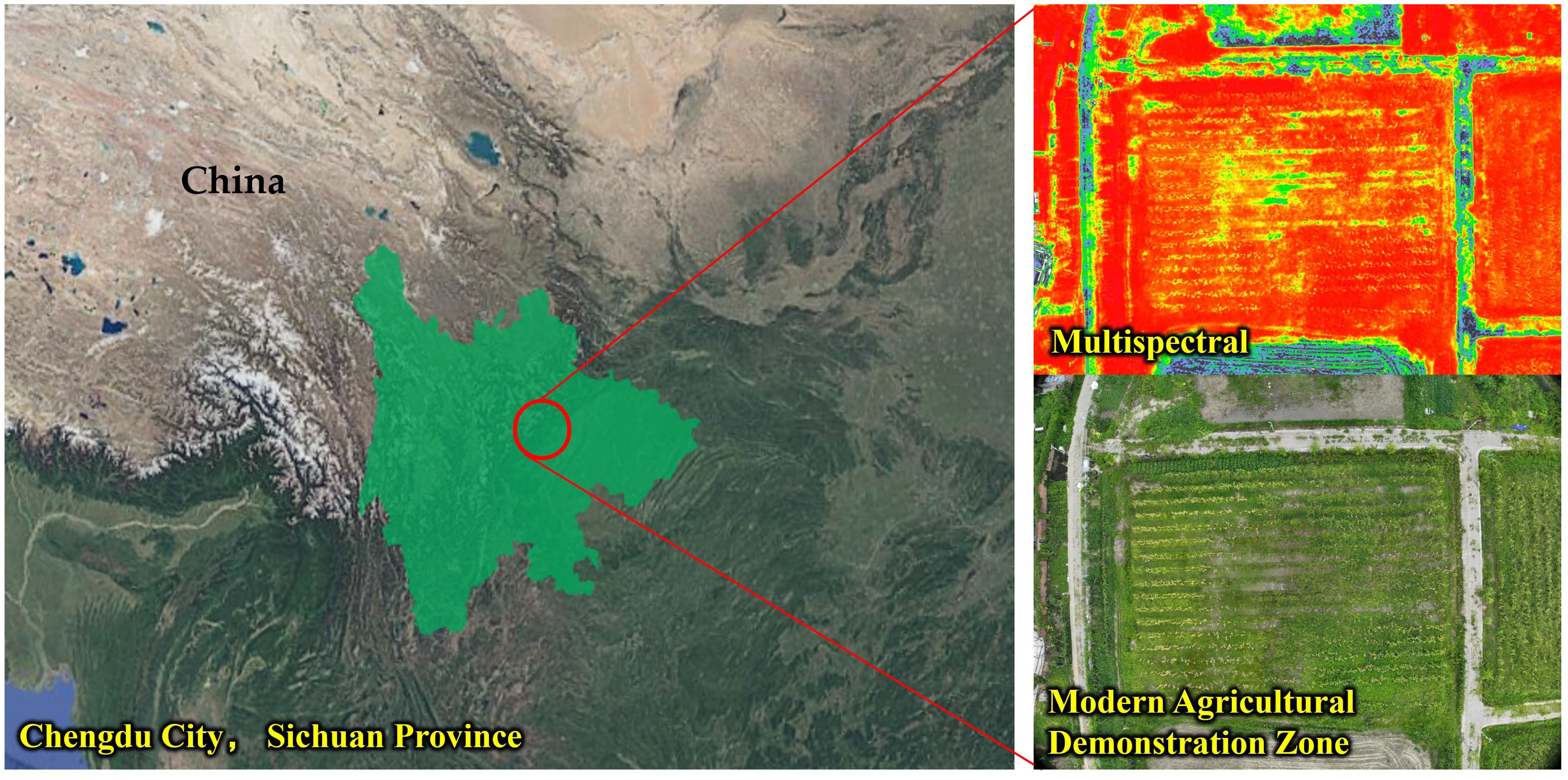 This study was conducted at the Modern Agriculture Demonstration Zone of Xihua University, located in the suburban area of Chengdu, Sichuan Province, China (Figure 1). The site spans approximately 50 hectares and is primarily cultivated with maize, representing typical characteristics of plain farmlands. The terrain is generally flat with a slope of less than 3°. The demonstration area adopts a fully mechanized maize cultivation system, featuring a row spacing of 1.0 m and a plant spacing of 0.25 m. The maize plants reach heights between 1.8 and 2.5 m, with a growth cycle ranging from 90 to 120 days. This cycle encompasses critical operational phases from the vegetative stage to maturity.