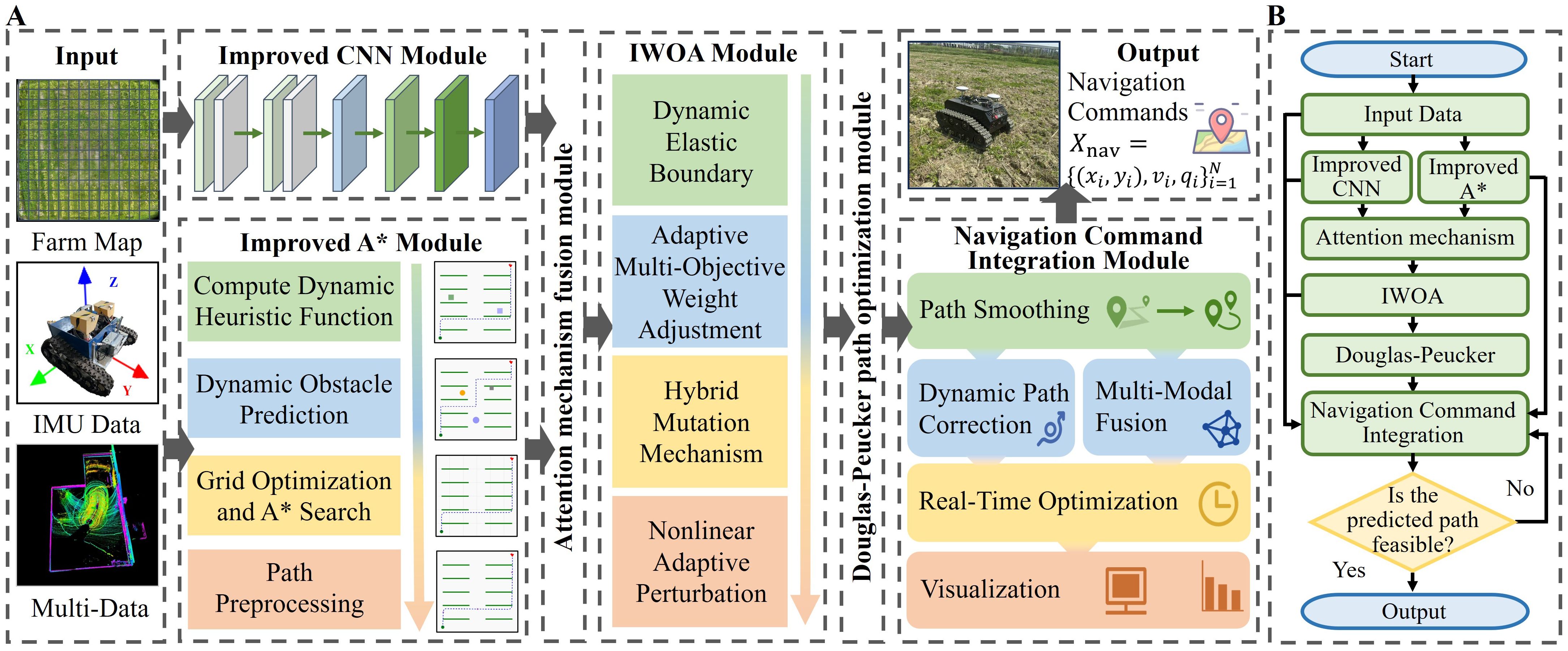 To address the complex and dynamic nature of maize field environments, this study proposes a comprehensive path planning and optimization framework for agricultural robots that integrates local trajectory prediction, global path planning, and multi-objective optimization (Figure 2A). The overall system architecture implements a closed-loop process from perception and decision-making to control. The improved CNN module predicts short-term local trajectories; the improved A* algorithm generates global paths; an attention mechanism fusion module synthesizes both local and global trajectories to form an initial path; the IWOA conducts multi-objective optimization; the improved Douglas–Peucker algorithm simplifies and smooths the path; and finally, the navigation instruction generation module converts the optimized path into executable commands for the robot, supporting dynamic obstacle avoidance and real-time adjustments (Figure 2B).