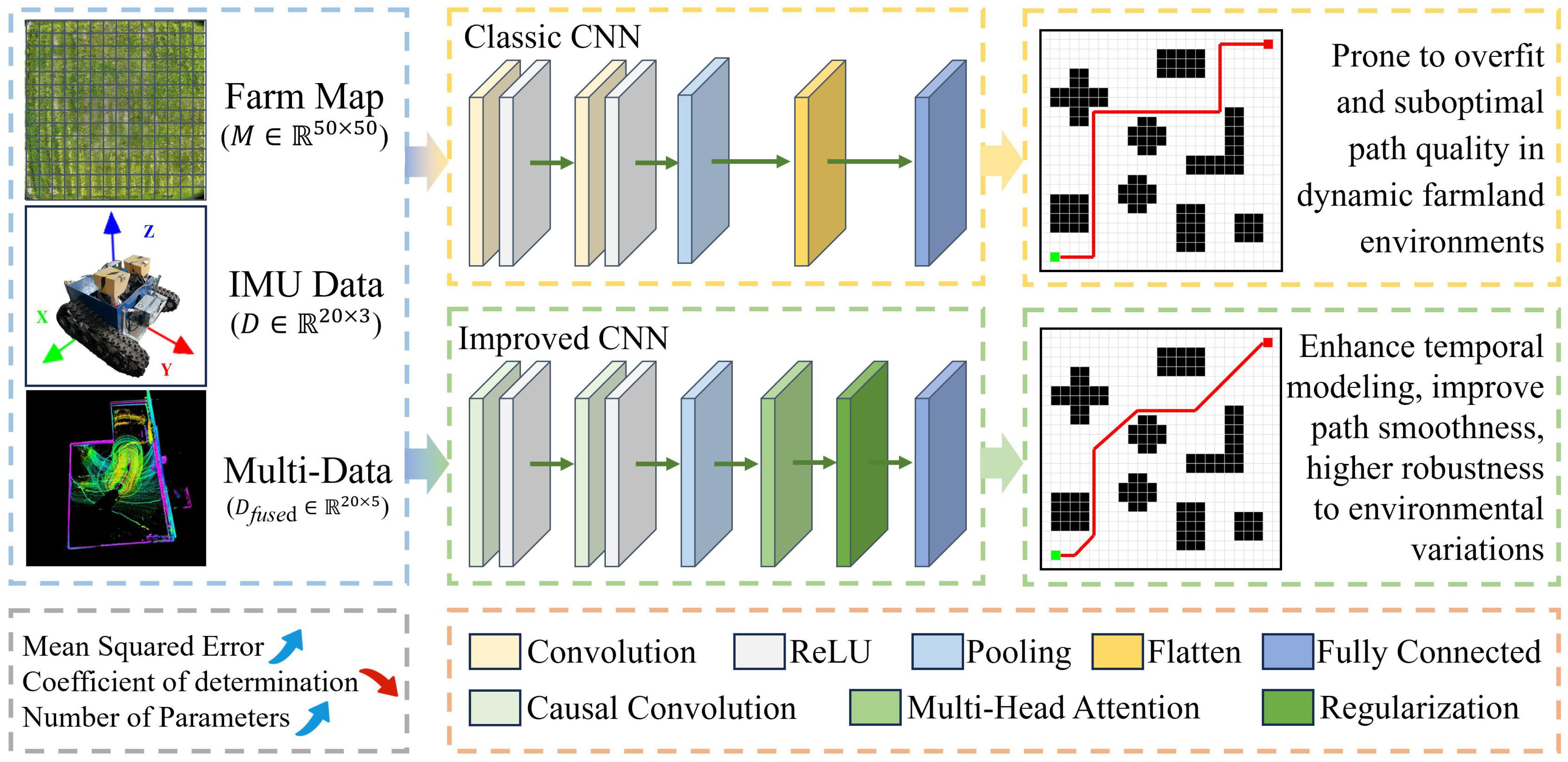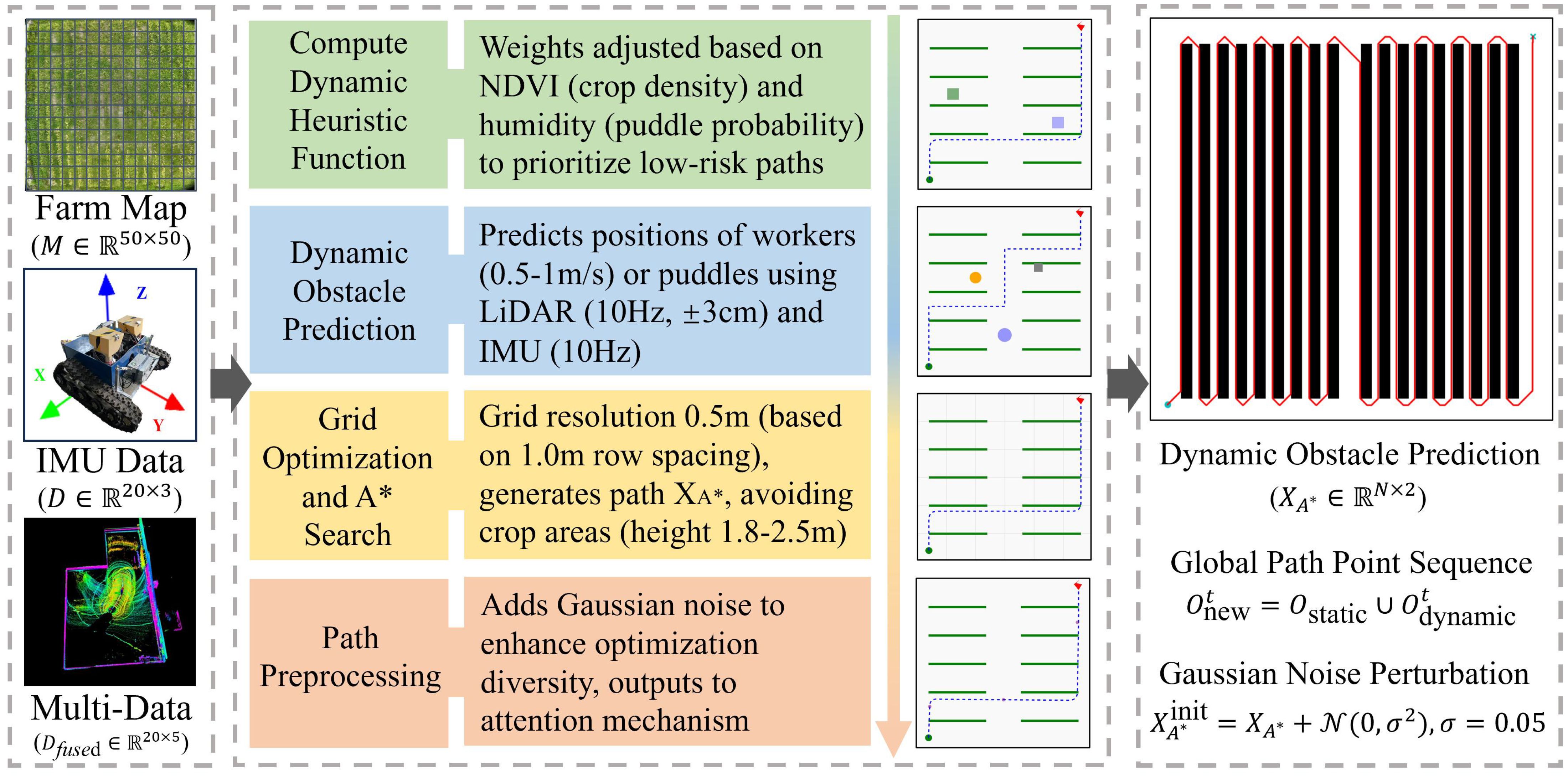 As global agriculture continues its evolution toward greater intelligence and precision, agricultural robots have come to occupy a central role in field tasks such as crop inspection, autonomous spraying, precision fertilization, and pest and disease identification (Yang et al., 2024a; Yang et al., 2025; Zhao et al., 2025). High-density crop cultivation environments—characterized by narrow operating spaces and severe occlusions—demand heightened efficiency, robustness, and intelligent decision-making capabilities from robotic path planning systems (Padhiary et al., 2024). However, real-world farmlands are inherently unstructured. They are not only populated by dynamic obstacles such as moving workers, operating machinery, and rain-formed puddles, but also complicated by uneven terrain, dense vegetation, and sensing uncertainties (Shamshiri et al., 2024). Consequently, developing path optimization methods equipped with environmental perception, multimodal data fusion, and dynamic responsiveness has become a critical frontier for enhancing the autonomy of agricultural robots (Guo et al., 2024).