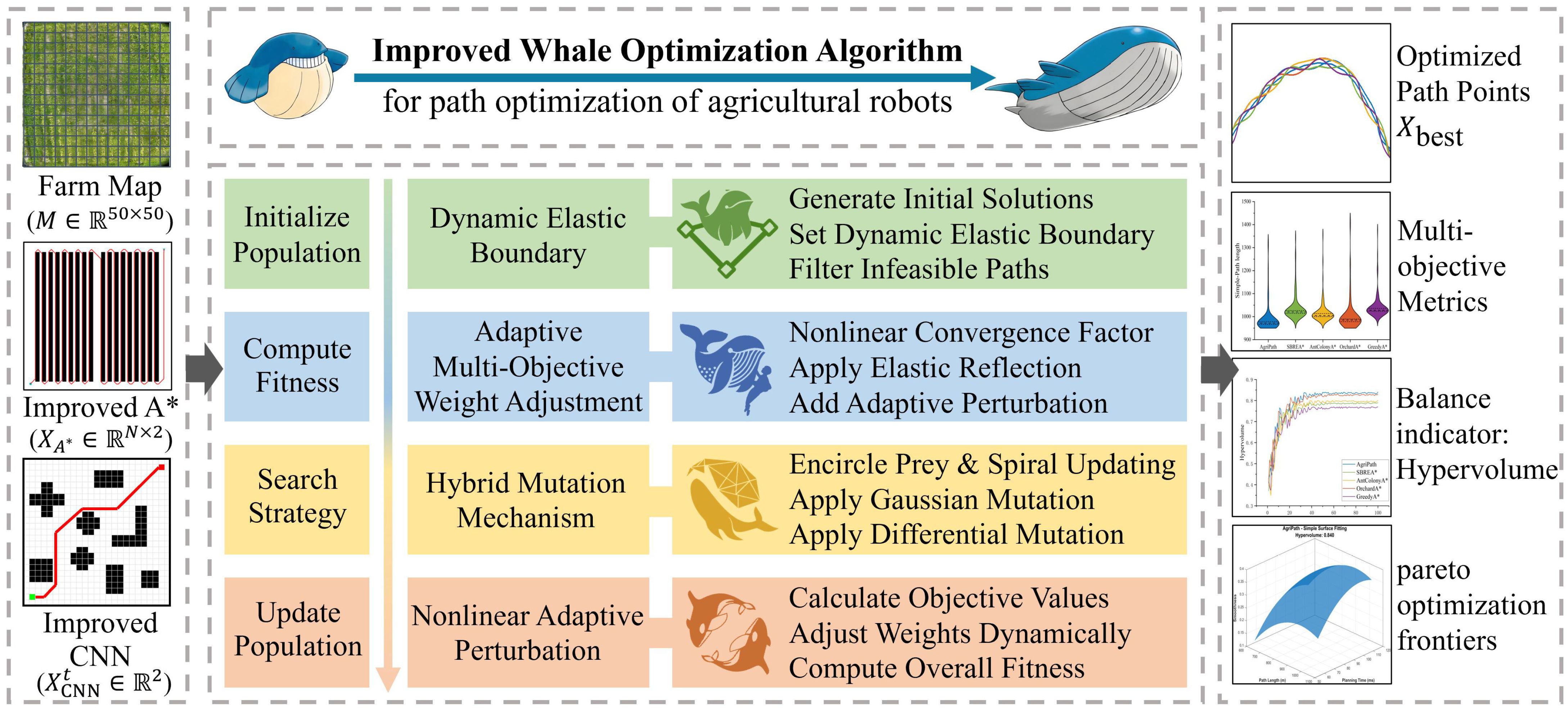 The IWOA module is designed to achieve multi-objective path optimization in complex maize field environments, targeting path length, smoothness, and planning time (Figure 5). The conventional whale optimization algorithm (WOA) simulates the hunting behavior of humpback whales to iteratively search the global solution space and generate an optimal path . This demonstrates its effectiveness in global optimization problems (Shen et al., 2023). However, in agricultural scenarios, WOA suffers from slow convergence, susceptibility to local optima, and limited adaptability—particularly due to its linear convergence factor and fixed weights, which restrict dynamic multi-objective trade-offs (Yuan et al., 2025). To address these limitations, the proposed IWOA operates synergistically with the improved CNN, improved A* algorithm, and path fusion modules, forming a closed-loop system that combines bottom-up path prediction with top-down global optimization, thereby significantly enhancing algorithmic performance.