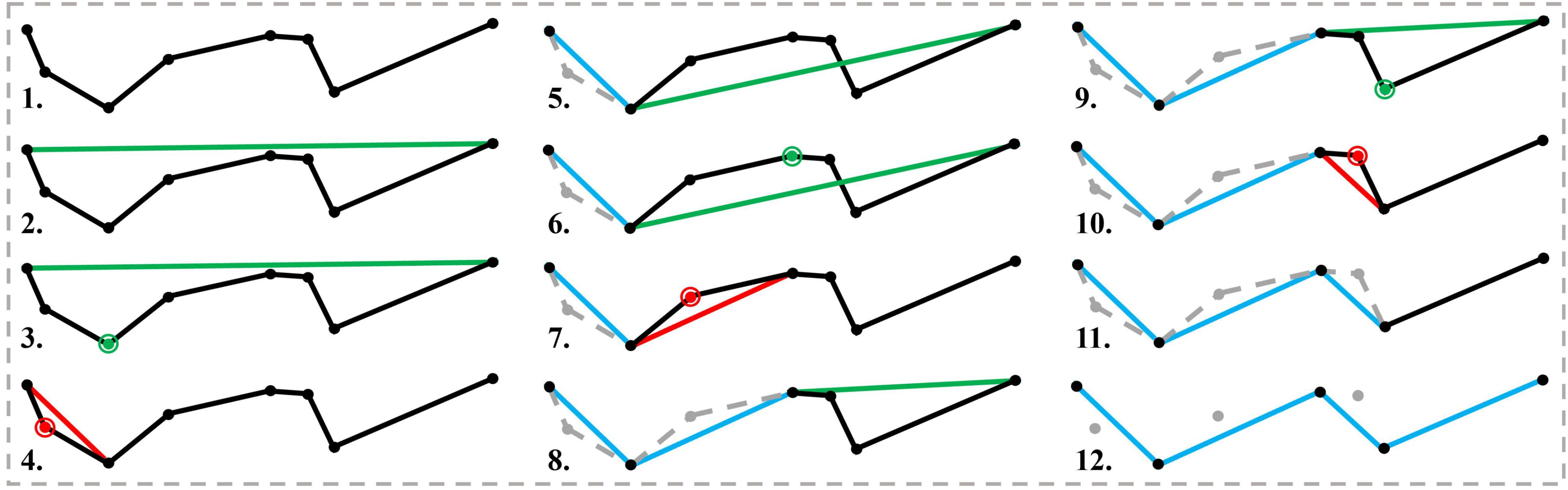 Path simplification employs a recursive segmentation algorithm that calculates the perpendicular distance of path points to the line segment connecting the segment’s endpoints. The threshold dynamically adapts according to environmental conditions as Equation 22:
