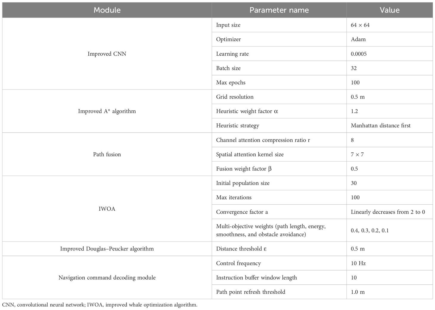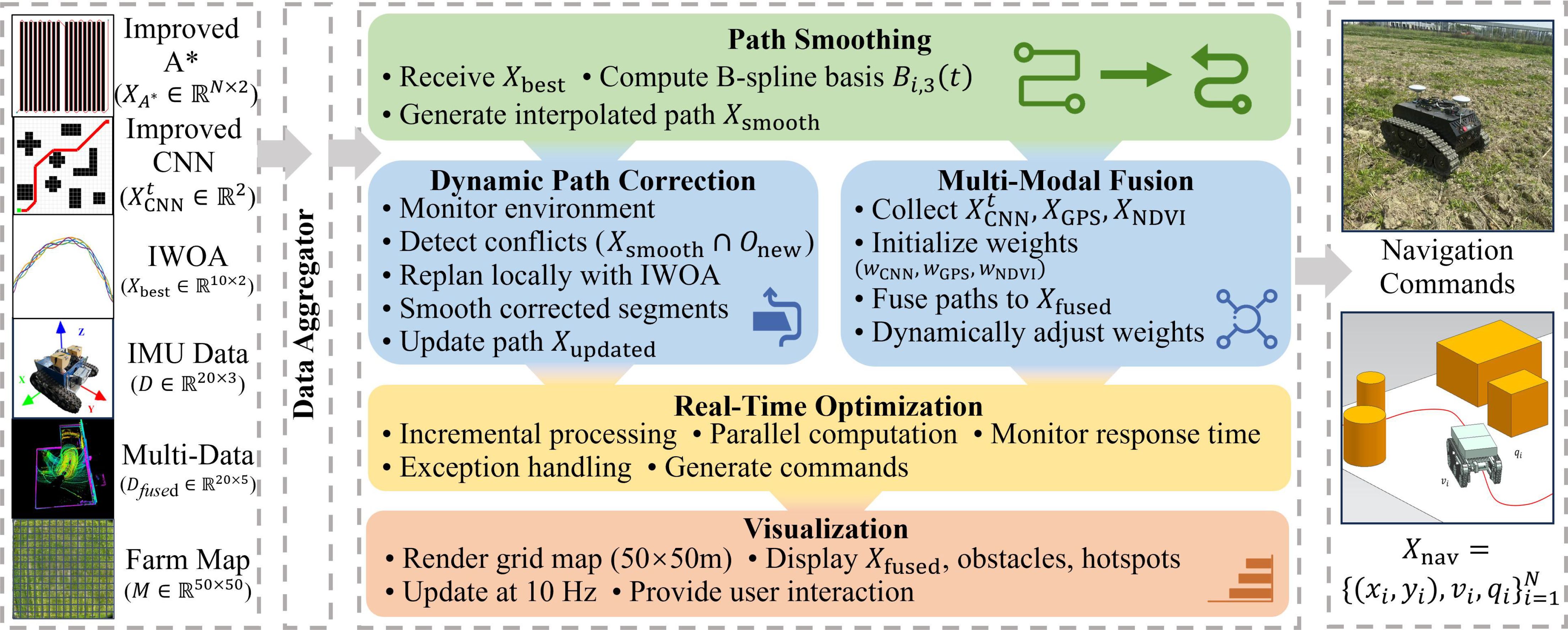 with initial weights set as , , and . These weights are dynamically adjusted within the range [0.1, 0.7] by the IWOA based on adaptive optimization informed by NDVI and humidity sensor data, thereby enhancing the accuracy and robustness of path fusion.