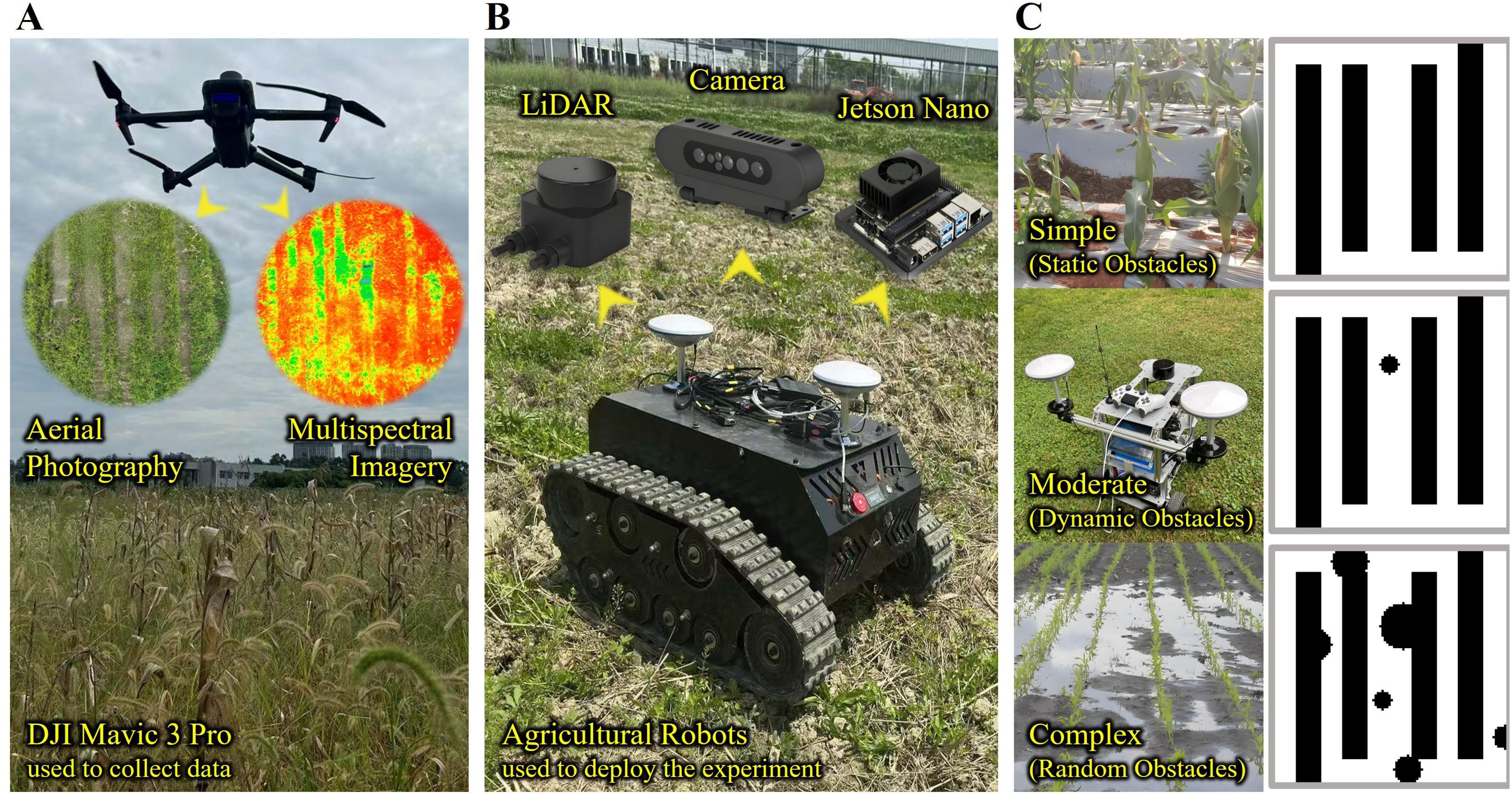 To assess the practicality and robustness of the path planning approach in complex farmland conditions, experiments are conducted within a 50 m × 50 m subsection of the demonstration site. The experimental platform comprises a DJI Mavic 3 Pro drone, equipped with a 20-MP camera and a hyperspectral sensor, and an unmanned agricultural robot, forming a comprehensive sensing and navigation system (Figures 8A,B). The robot, custom-built with dimensions of 1.2 m × 0.8 m × 0.6 m, is fitted with a LeiShen 16-line LiDAR, RGB camera, and an IMU (MPU-6050), optimized to minimize occlusion within the 1.0-m row spacing of the maize field. This platform, based on the Jetson Nano embedded system, enables real-time perception and processing of multi-source sensory data, with sensor configurations ensuring 10-Hz data fusion.