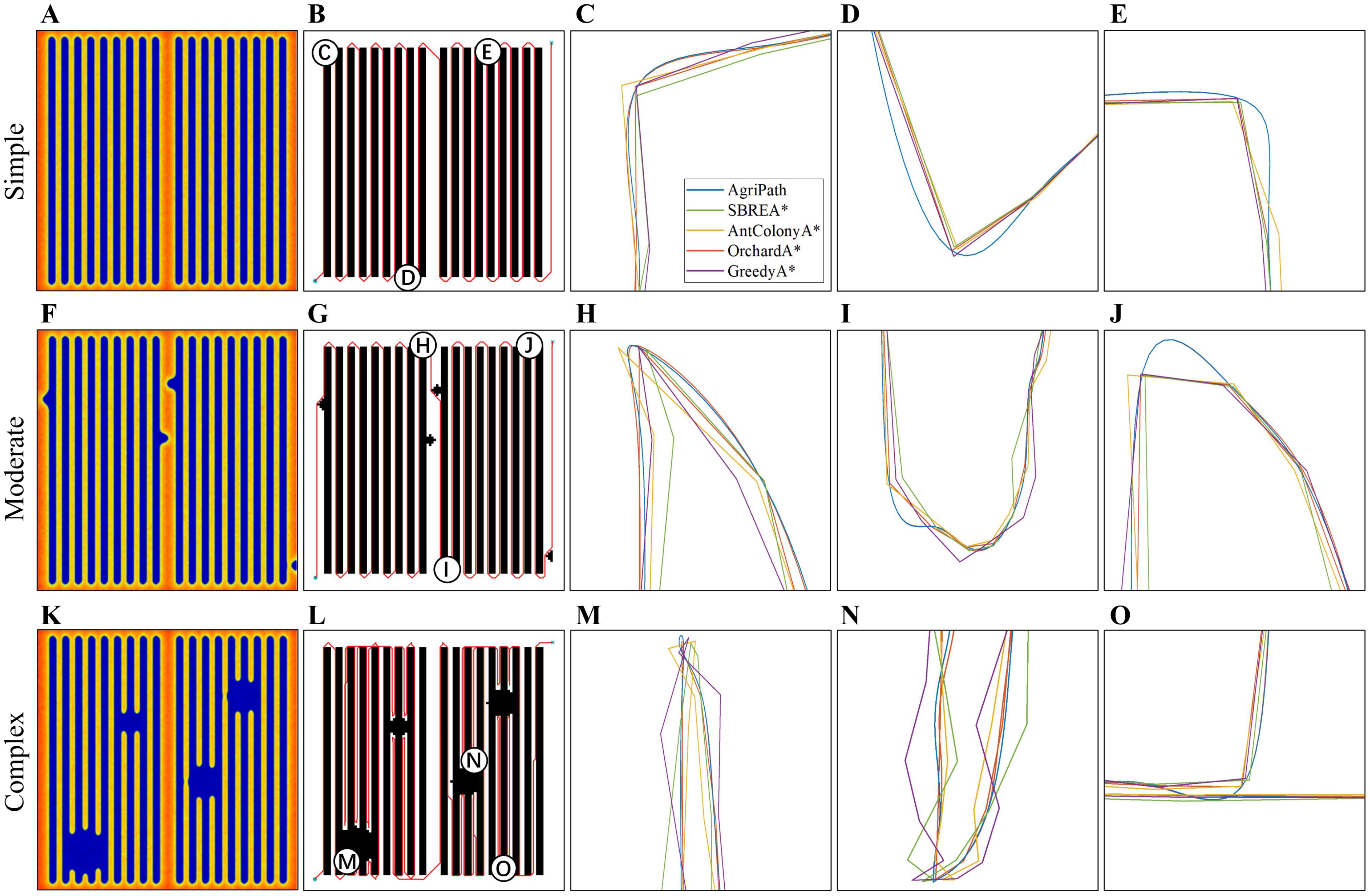 The AgriPath outperforms advanced algorithms—SBREA*, Ant Colony A*, Orchard A*, and Greedy A*—in path length (971.34–1,457.32 m), smoothness (0.40–0.53), planning time (125.1–200.3 ms), and dynamic obstacle avoidance success rate (0.92–0.98). Its originality lies in the following innovations: the improved CNN employs causal convolution and multi-head self-attention mechanisms to improve short-term prediction accuracy; the improved A* algorithm leverages dynamic heuristic functions and Kalman filtering to enhance adaptability to dynamic environments; the IWOA utilizes non-linear convergence factors and differential evolution for multi-objective optimization, achieving hypervolume indicators of 0.64–0.84; and the improved Douglas–Peucker algorithm, combined with navigation command integration, ensures real-time performance (single-point latency <0.1 seconds). These innovations collectively form an efficient closed-loop system.