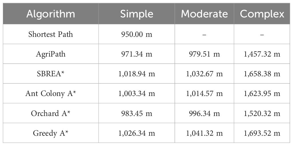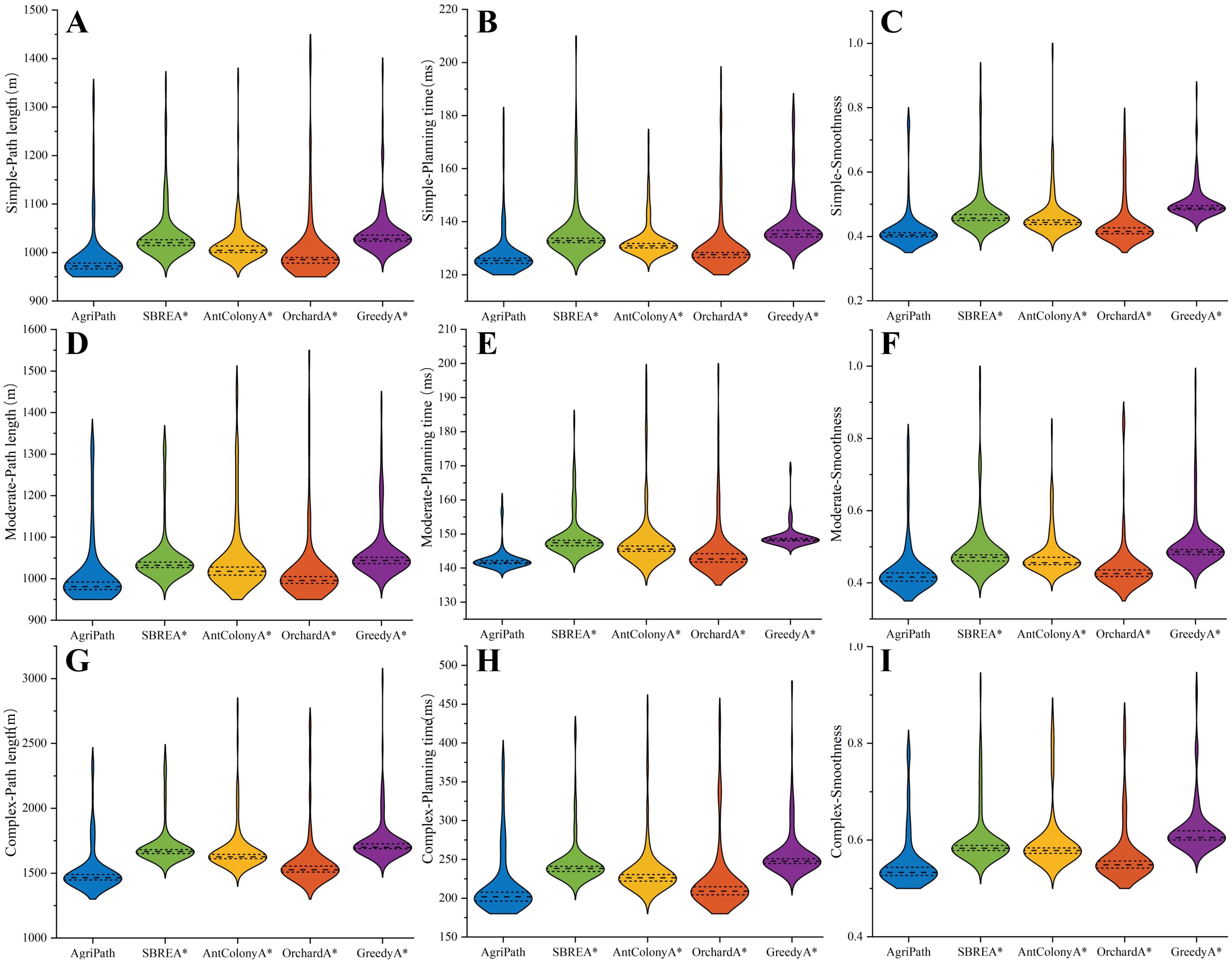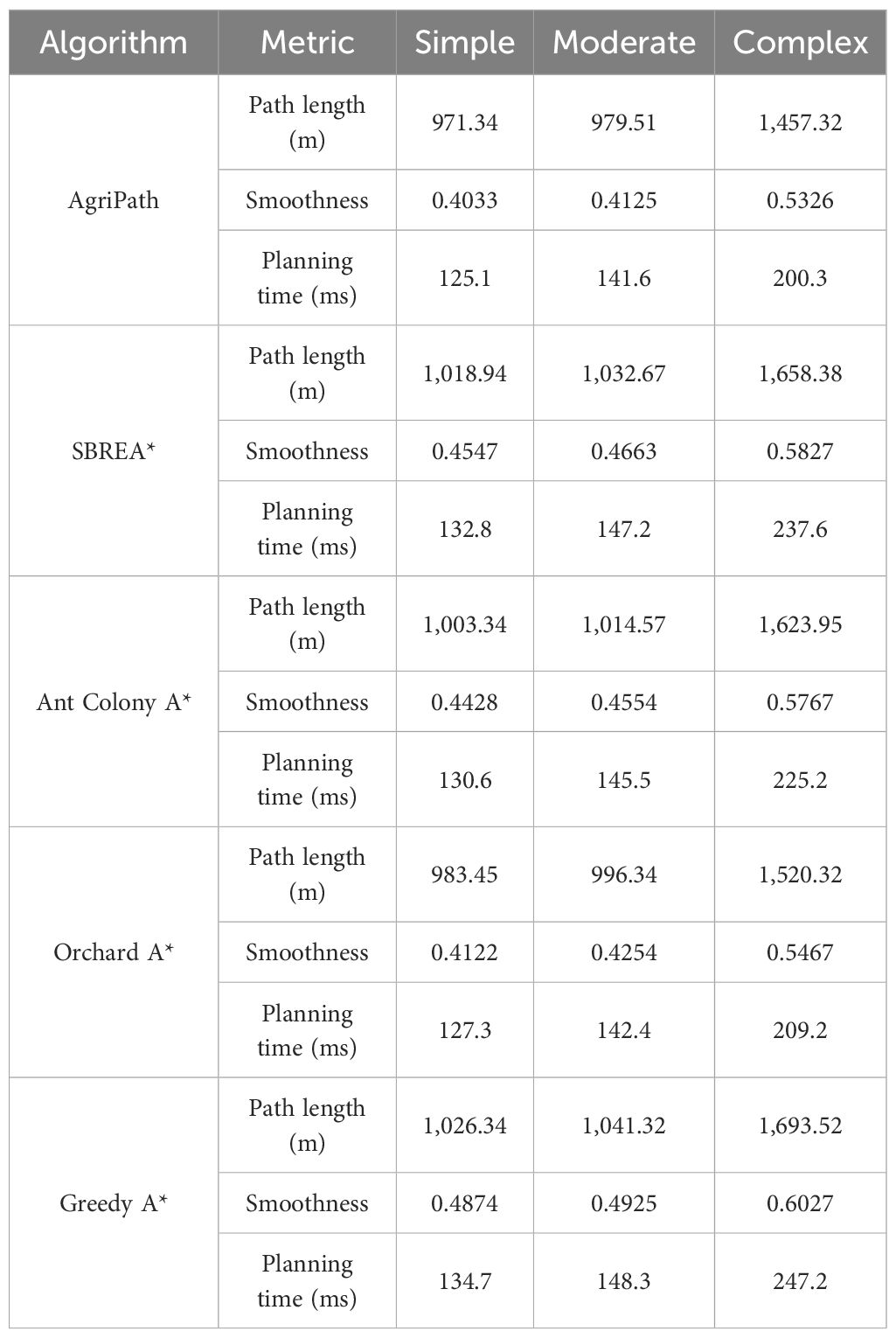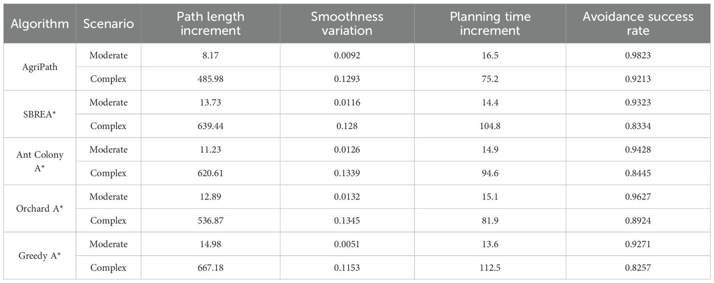 AgriPath exhibits exceptional performance in the moderate and complex scenarios across path length increment, smoothness increment, planning time increment, and dynamic obstacle avoidance success rate, with tightly clustered box plot distributions and low dispersion, surpassing SBREA*, Ant Colony A*, Orchard A*, and Greedy A*. In the moderate scenario, AgriPath’s median path length increment is 8.17 m, significantly lower than competitors’ ranges of 11.23 to 14.98 m, with SBREA* recording 13.73 m due to insufficient dynamic adjustments leading to elongated paths (Figure 14A). The median smoothness increment for AgriPath is 0.0092, higher than Greedy A*’s 0.0051 but superior to other algorithms’ 0.0116 to 0.0132, reflecting more consistent path quality (Figure 14C). The median planning time increment of 16.5 ms exceeds Greedy A*’s 13.6 ms and others’ 14.4 to 15.1 ms, yet AgriPath achieves a dynamic obstacle avoidance success rate of 0.9823, outperforming competitors’ 0.9271 to 0.9627, particularly Greedy A*’s 0.9271, which struggles with dynamic obstacles due to its simplistic strategy (Figures 14E,G). AgriPath’s CNN-based short-term predictions significantly enhance avoidance efficiency. In the complex scenario, AgriPath’s median path length increment is 485.98 m, superior to competitors’ 536.87 to 667.18 m, with Ant Colony A*’s 620.61 m hindered by slow iterative convergence (Figure 14B). AgriPath’s median smoothness increment of 0.1293 outperforms competitors’ 0.1153 to 0.1345, including Greedy A*’s 0.1153 (Figure 14D). Its median planning time increment of 75.2 ms is notably lower than competitors’ 81.9 to 112.5 ms, and its dynamic obstacle avoidance success rate of 0.9213 exceeds competitors’ 0.8257 to 0.8924, with SBREA* at 0.8334, limited by the absence of a multi-objective optimization framework (Figures 14F,H). AgriPath’s performance metrics in the moderate scenario (path length increment of 8.17 m, smoothness increment of 0.0092, planning time increment of 16.5 ms, and avoidance success rate of 0.9823) and the complex scenario (path length increment of 485.98 m, smoothness increment of 0.1293, planning time increment of 75.2 ms, and avoidance success rate of 0.9213) demonstrate superior performance. Although Greedy A* shows slight advantages in smoothness and planning time increments, AgriPath’s robustness and adaptability in dynamic, complex environments provide efficient support for agricultural robotic navigation.