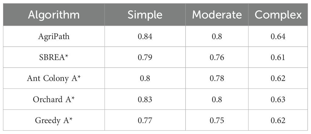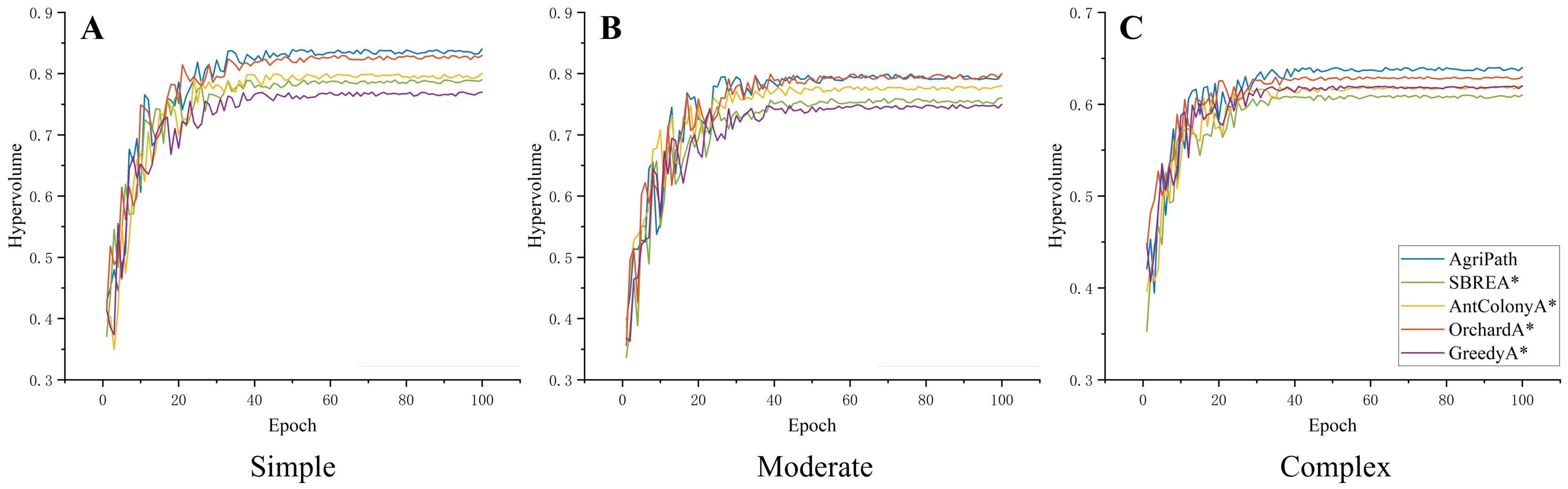 AgriPath exhibits faster hypervolume growth and greater stability across all three scenarios, significantly outperforming SBREA*, Ant Colony A*, Orchard A*, and Greedy A*. In the simple scenario, AgriPath’s hypervolume rapidly increases from 0.4 to 0.84, stabilizing after just 60 iterations, surpassing competitors’ ranges of 0.77 to 0.83. For instance, SBREA* reaches only 0.79 due to slower convergence from limited multimodal synergy, whereas AgriPath’s IWOA and multisource perception ensure rapid convergence and optimized paths (Figure 11A). In the moderate scenario, AgriPath’s hypervolume rises from 0.35 to 0.80, stabilizing after 50 iterations, outperforming competitors’ 0.75 to 0.80 ranges. Greedy A*’s 0.75 reflects its inability to adapt to dynamic obstacles, while AgriPath’s attention mechanisms and CNN-based short-term predictions markedly enhance dynamic obstacle adaptability (Figure 11B). In the complex scenario, AgriPath’s hypervolume increases from 0.3 to 0.64, stabilizing after 70 iterations, surpassing competitors’ 0.61 to 0.63 ranges. Ant Colony A*’s 0.62 is constrained by low iterative efficiency in complex environments with random obstacles like puddles, whereas AgriPath’s multi-objective optimization framework, driven by the IWOA, ensures robustness and stability in dynamic settings (Figure 11C).