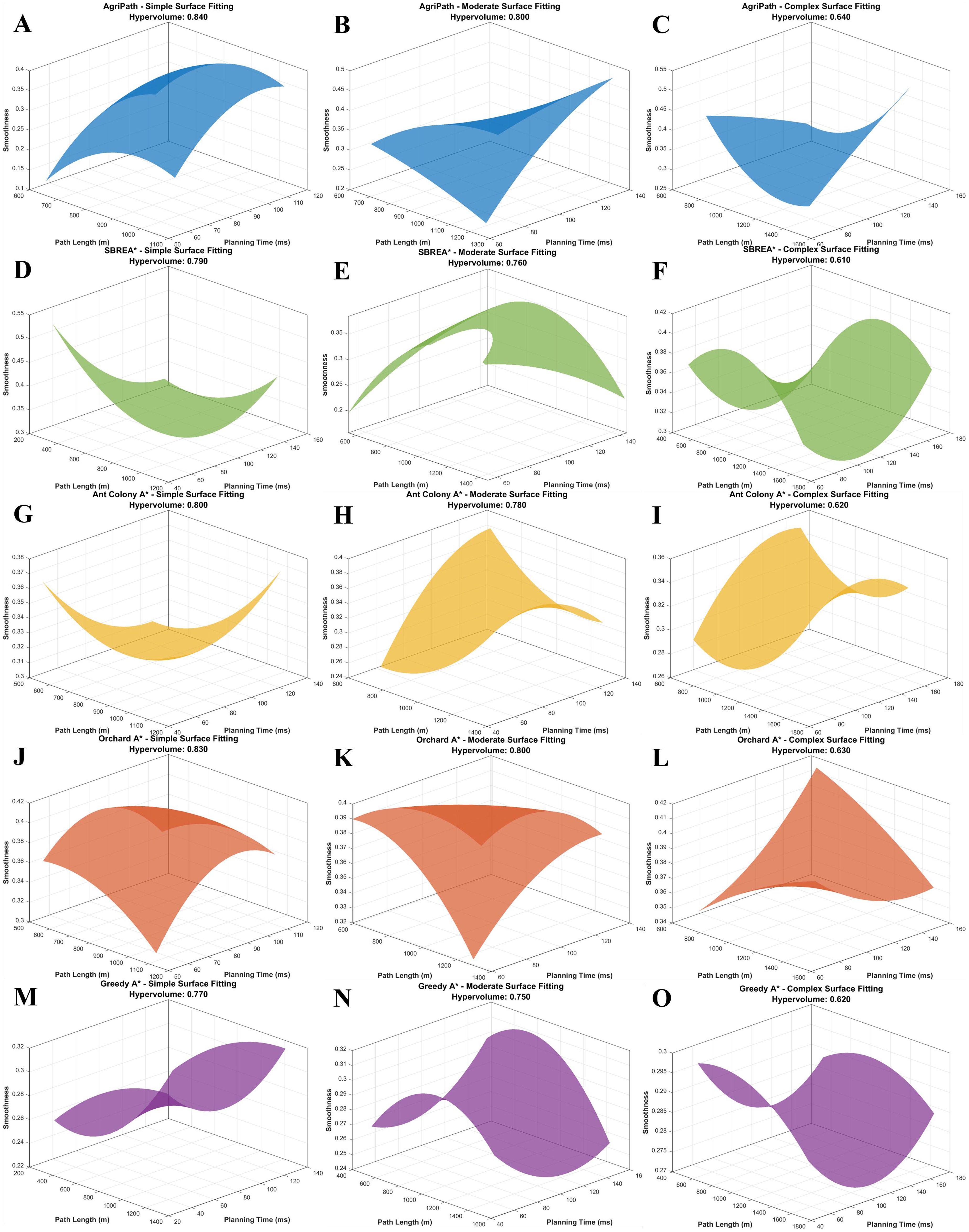 This section compares the solution set distributions of the AgriPath against SBREA*, Ant Colony A*, Orchard A*, and Greedy A*—in terms of path length, smoothness, and planning time across simple, moderate, and complex scenarios—using three-dimensional Pareto frontier curves. Three-dimensional surface fitting diagrams depict the coverage and balance of each algorithm within the multi-objective space. AgriPath, leveraging adaptive weights and a hybrid mutation mechanism within its IWOA, exhibits broader Pareto frontier coverage and more uniform solution set distributions.