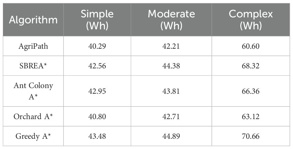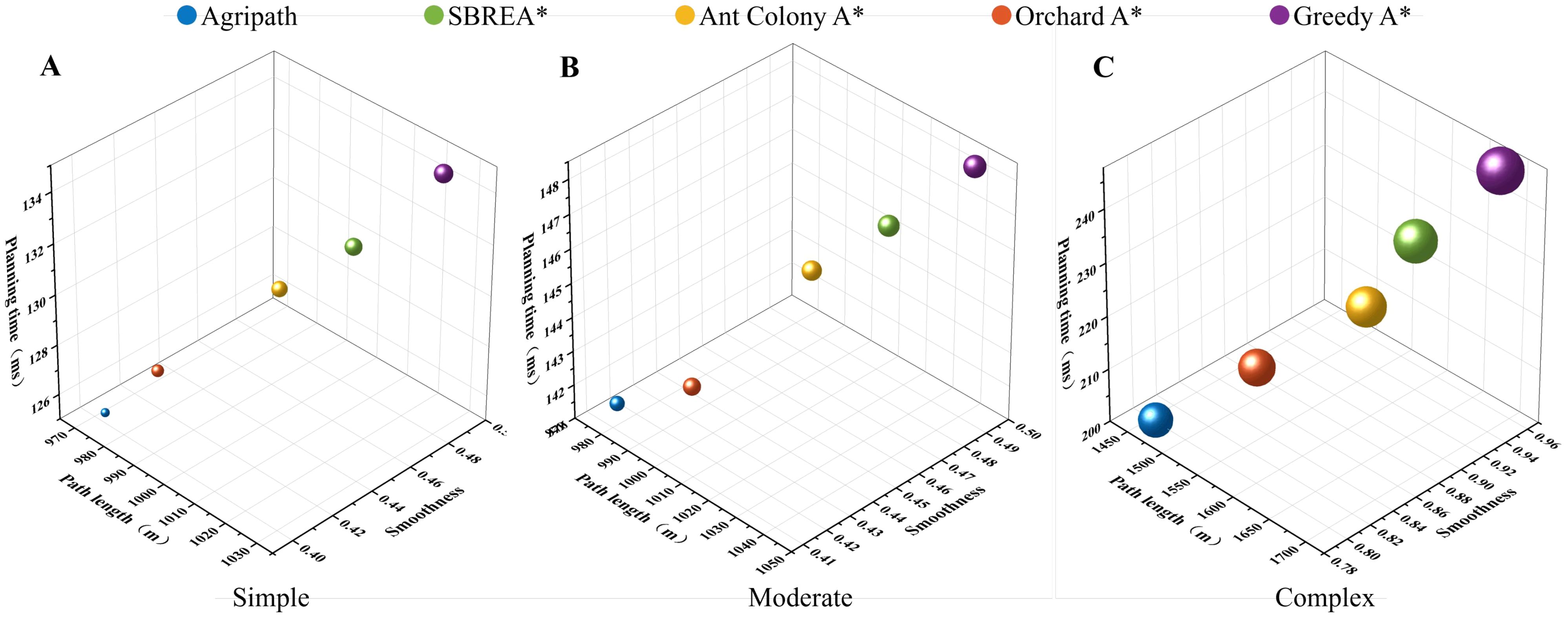 AgriPath exhibits superior energy efficiency across the simple, moderate, and complex scenarios, significantly outperforming SBREA*, Ant Colony A*, Orchard A*, and Greedy A*, as evidenced by the smallest scatter point sizes, indicating high energy efficiency. In the simple scenario, AgriPath’s power consumption in the multi-objective optimal state is 40.29 Wh, outperforming competitors’ ranges of 42.56 to 43.48 Wh. For example, SBREA*’s 42.56-Wh consumption reflects lower efficiency due to the absence of dynamic optimization, whereas AgriPath’s parallel optimization and multimodal perception substantially reduce energy use (Figure 13A). In the moderate scenario, AgriPath’s power consumption is 42.21 Wh, surpassing competitors’ ranges of 42.71 to 44.89 Wh. Greedy A*’s 44.89-Wh consumption results from its simplistic strategy’s inability to adapt to dynamic obstacles, while AgriPath’s CNN-based short-term predictions enhance energy efficiency, reflected in smaller scatter points (Figure 13B). In the complex scenario, AgriPath’s power consumption of 60.60 Wh outperforms competitors’ ranges of 63.12 to 70.66 Wh, with Ant Colony A*’s 66.36 Wh hindered by slow iterative convergence (Figure 13C).