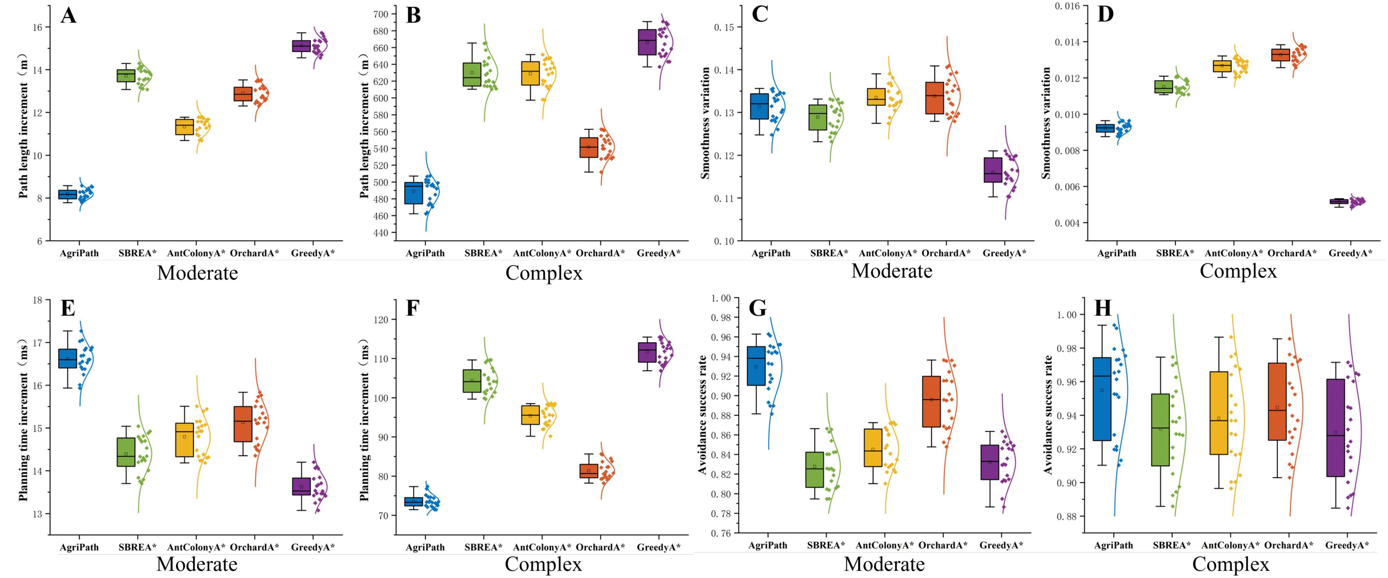 This section evaluates the robustness of the AgriPath compared to advanced algorithms—SBREA*, Ant Colony A*, Orchard A*, and Greedy A*—through 20 experimental trials in the moderate and complex scenarios relative to the simple scenario. The assessment focuses on increments in path length, smoothness, planning time, and dynamic obstacle avoidance success rate, with mean values reported in Table 7. Box plots illustrating the statistical distributions of these metrics, including medians, interquartile ranges, and dispersion, confirm AgriPath’s superior performance in increment control and obstacle avoidance.