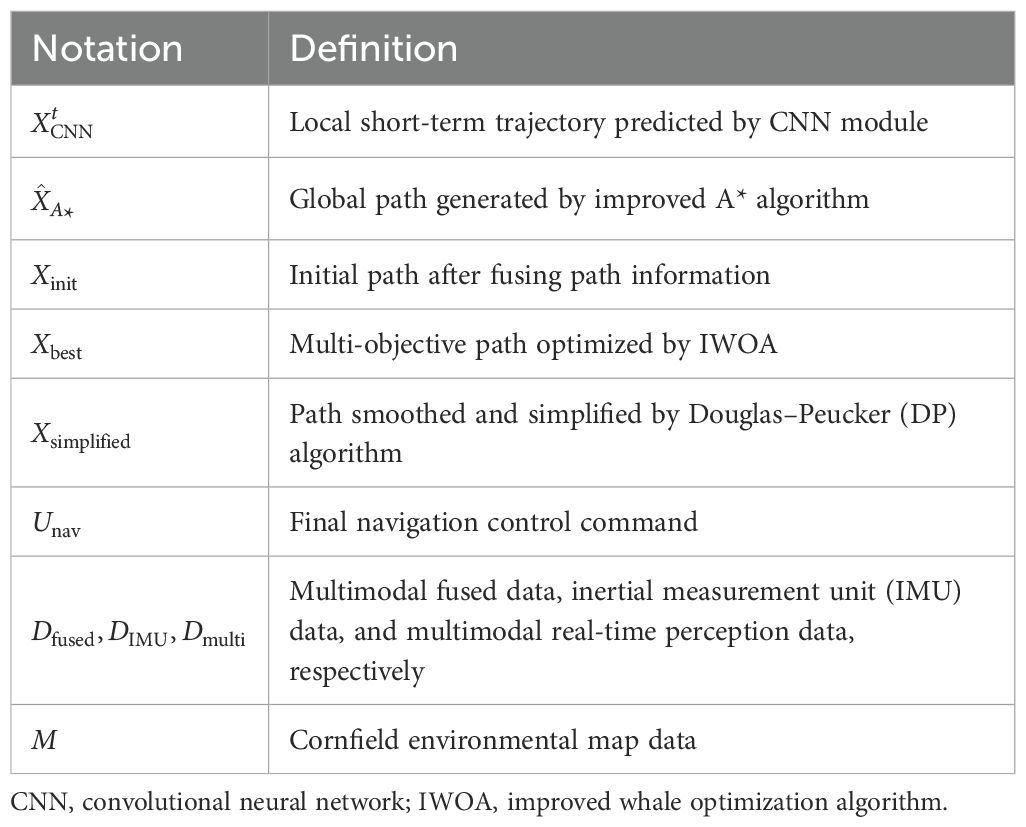 Despite these achievements, several limitations warrant consideration. The experimental scenarios were confined to flat agricultural fields, conducted during the maize growth cycle, 90–120 days primarily in the vegetative to maturity stages, where plant heights of 1.8–2.5 m and densities influenced sensor detection, particularly causing LiDAR occlusion. This restricted the algorithm’s generalizability to hilly or larger-scale terrains, which remain untested. Additionally, the reliance of the improved CNN module and IWOA module on LiDAR and the Jetson Nano’s computational capabilities may limit deployment on low-cost agricultural robots. The robustness of the IWOA in extreme dynamic scenarios, such as high-speed moving obstacles or adverse weather conditions like rain, which increased puddle formation in the complex scenario and impacted path planning, requires further investigation, as performance fluctuations reflected in the 0.92 avoidance success rate may occur, despite sunny conditions enhancing NDVI accuracy. LiDAR occlusion, caused by maize heights in maturity stages, resulted in ~25% point count drop, reducing detection accuracy by 5%–10%. This was mitigated by multimodal fusion with RGB cameras, but future work could incorporate ultrasonic sensors for occlusion compensation. These environmental factors were not fully controlled, adding complexity to the results. Moreover, while the ablation study confirmed individual component contributions, it did not comprehensively analyze inter-component interactions, limiting insights into their synergistic mechanisms. To address these gaps, future research could expand experimental scenarios to include varied terrains and growth stages, incorporating growth stage models such as logistic growth curves and weather sensors such as rain gauges to dynamically adjust path planning. Optimizing lightweight models and integrating reinforcement learning could enhance dynamic adaptability, while analyzing inter-component interactions would further improve the algorithm’s practicality and robustness, thereby supporting agricultural robotic navigation across a broader range of scenarios and seasons.