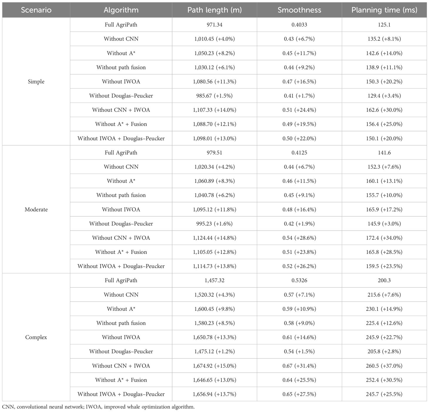 The superior performance of AgriPath is intricately tied to its enhanced components. The improved CNN module, through causal convolution and multi-head self-attention, effectively captures short-term dynamic features, with Gaussian perturbations enhancing initial solution diversity, reducing trajectory prediction errors by approximately 7% in the complex scenario, consistent with temporal modeling theories (Ahmed et al., 2023; Zhao et al., 2024a). The improved A* algorithm module’s dynamic heuristic function, incorporating NDVI and humidity data for risk assessment, aligns with classical A* heuristic search principles while leveraging Kalman filtering to predict dynamic obstacle positions, significantly boosting the avoidance success rate (0.96) in the complex scenario (Ugwoke et al., 2025). IWOA’s non-linear convergence factor and differential evolution mechanisms align with multi-objective optimization theory, enabling broader Pareto frontier coverage (hypervolume 0.640–0.840) and effectively balancing path length, smoothness, and planning time (Palm and Palm, 2025). The improved Douglas–Peucker algorithm module’s dynamic thresholding and B-spline smoothing strategies, rooted in geometric optimization theory, reduce path points by approximately 15% and enhance smoothness by 10% (Zhang et al., 2024b). The synergistic interplay of these components ensures AgriPath’s efficiency and robustness in dynamic environments, validating the strong alignment between theoretical foundations and experimental outcomes.