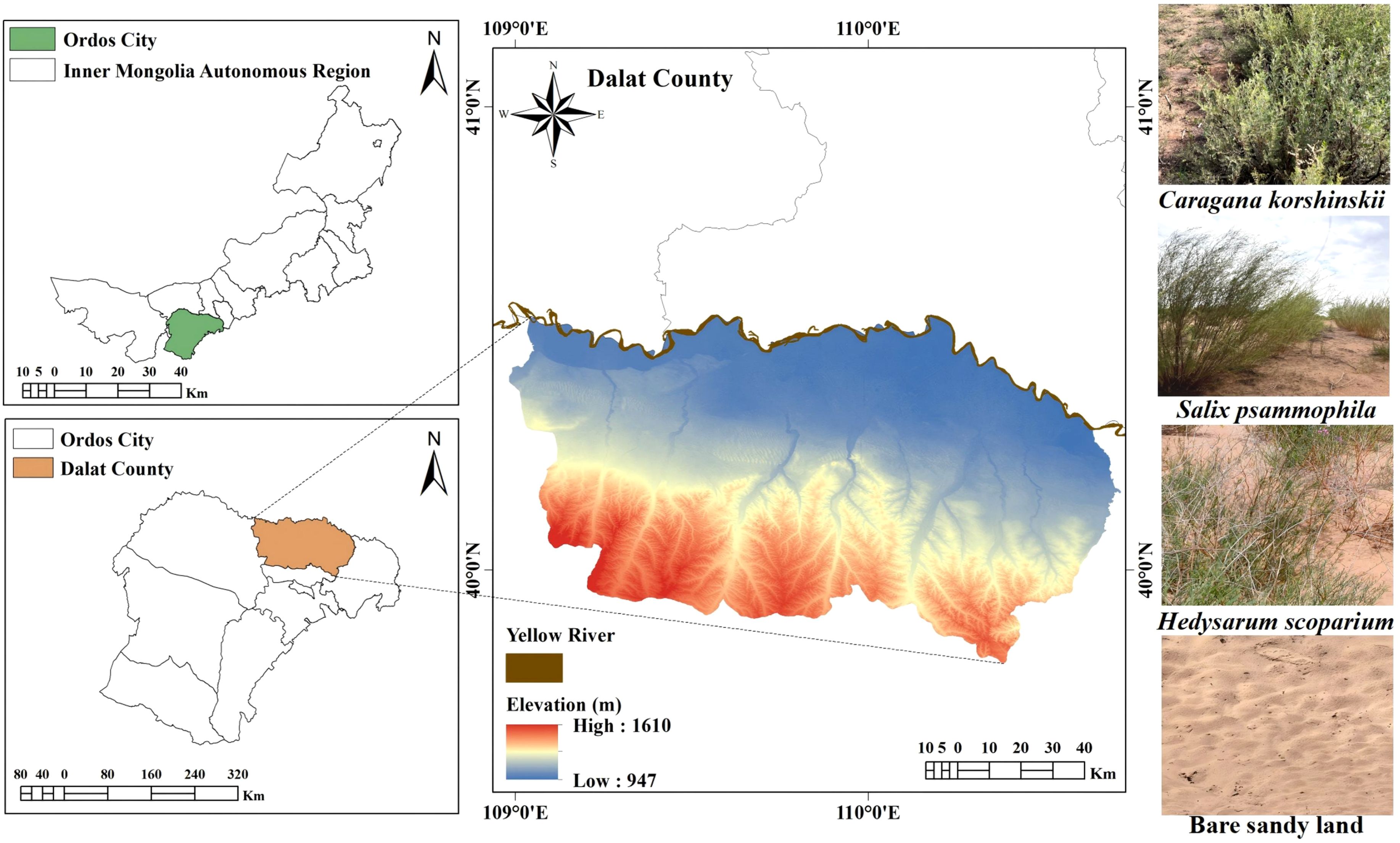 The Kubuqi Desert is the seventh largest desert in China (107°00’–111°30’ E, 39°15’–40°45’ N), located at the southern edge of the middle reaches of the Yellow River. The sampling site for this study was the Kubuqi Desert Closed Reserve in Dalat County (Figure 1), Ordos City (109°00’–110°45’ E, 40°00’–40°30 N). The management unit of this area is the Ordos Forestation General Farm. Established in 1978, it mainly operates in the east-central part of the Kubuqi Desert, which is one of the key construction units of the ‘Three Norths’ protection forests established by the Chinese government (Ordos-Daily-News, 2024). The area has a temperate continental climate, which is characterised by high winds, sand, dryness, and little rain. The summers are hot and short, and the winters are cold and long, with drastic temperature changes. The average annual precipitation is 240–360 mm, with most occurring in July–September, accounting for about 61% of the annual total. The average number of sunshine hours each year is 3,159.4 hours, and the average annual frost-free period is 130–140 days (Li et al., 2023b; Yongsheng et al., 2023; Baidu-Library, 2024; Han et al., 2024a). The main soil type in the sampling area is gray desert soil. The vegetation is primarily composed of sand-dwelling shrubs, subshrubs, and herbaceous plants, such as Caragana korshinskii, Artemisia ordosica, and Agriophyllum squarrosum. In recent years, the Chinese government has increasingly focused on desertification control. Following the launch of key ecological programs like the ‘Three-North Shelterbelt Project’ and the Yellow River Basin conservation/development strategy, extensive sand-fixing plantations have been installed in the study area, resulting in substantial ecological restoration and environmental improvement (XinHua-News-Agency, 2014; Li et al., 2023a; UNESCO, I.C.f.C.a.S.D, 2023).