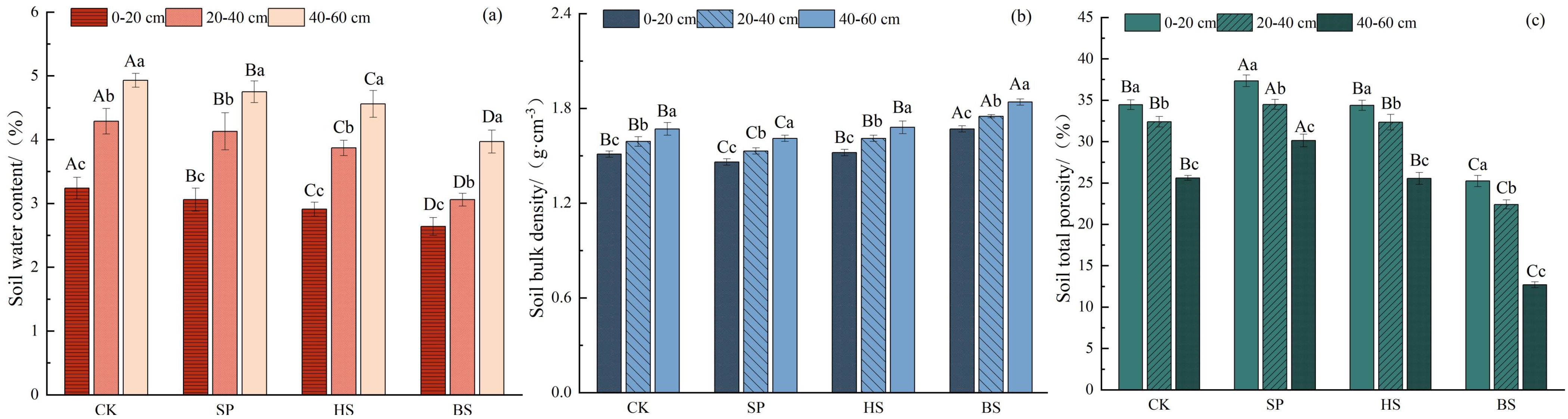 Figure 2. Soil physical propertiesin different sandfixation plantations. (a) Soil water content, (b) Soil bulk density, and (c) Soil total porosity.