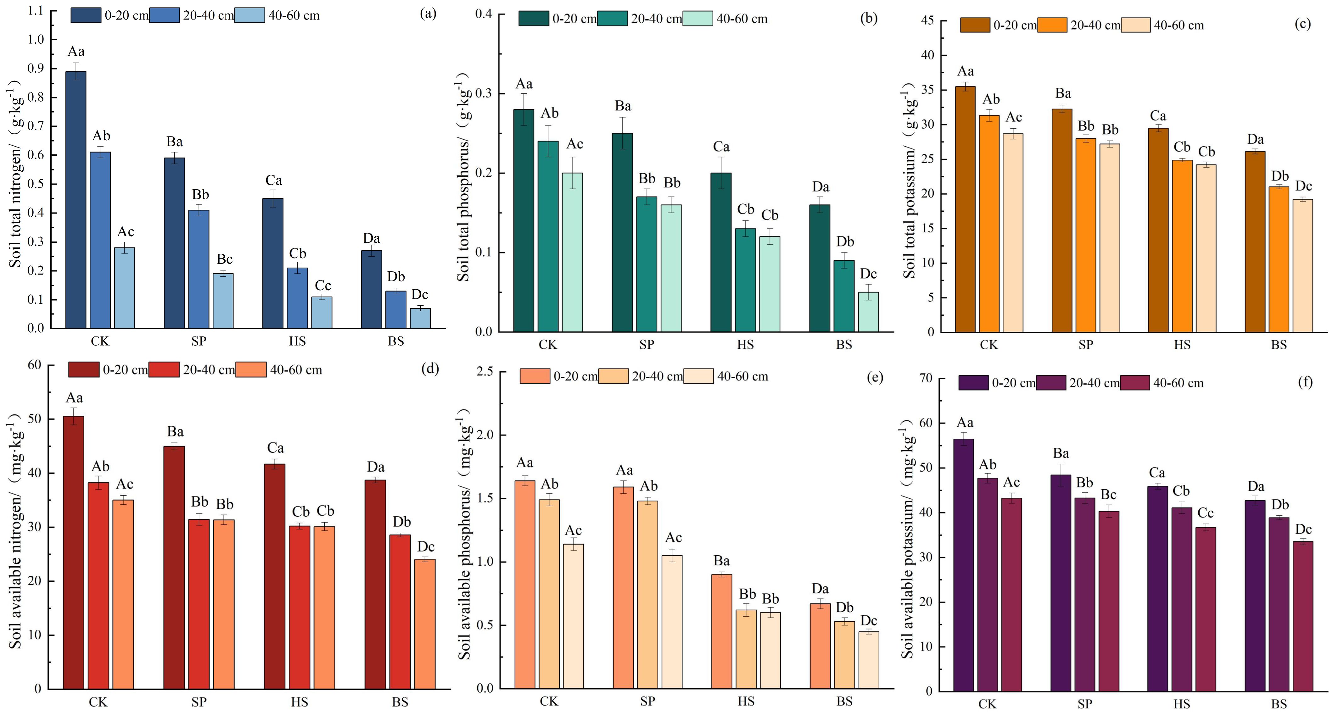Figure 3. Soil nutrient characteristics in different sand fixation plantations. (a–c) Total nitrogen, phosphorus, and potassium in the soil; (d–f) Available nitrogen, phosphorus, and potassium in the soil.