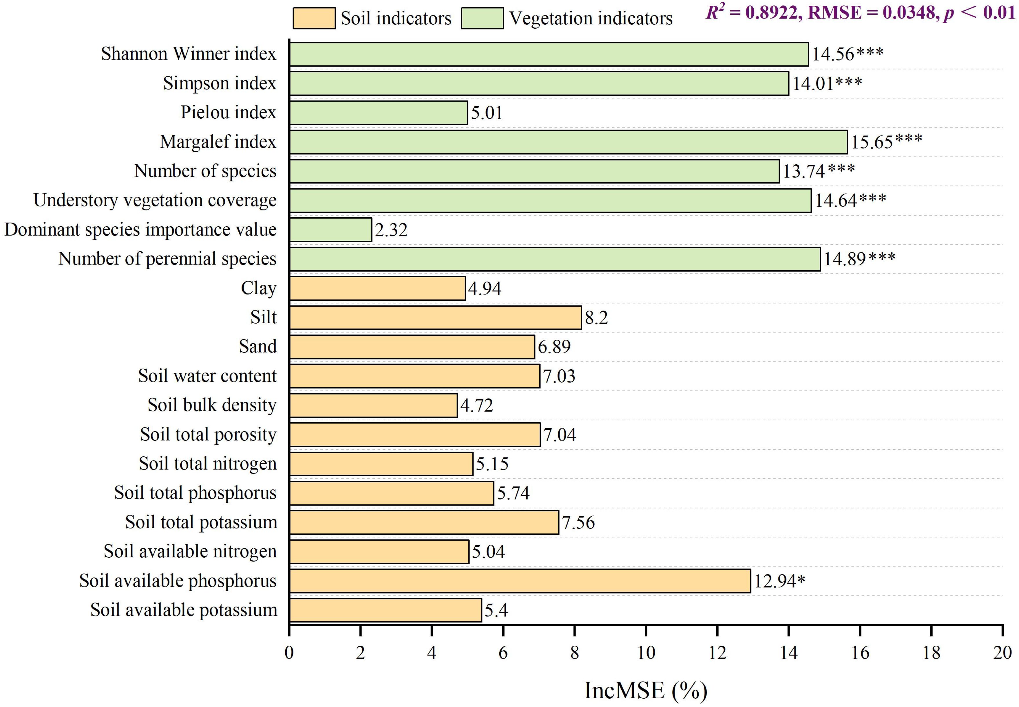 The random forest model is a powerful ensemble machine learning algorithm that constructs a multitude of decision trees during training and outputs the mean prediction of the individual trees for regression tasks (Rigatti, 2017; Charbuty and Abdulazeez, 2021). In this study, a random forest regression was employed to predict the comprehensive restoration score (from GRA) and identify the most influential drivers among the measured vegetation and soil properties. All analyses were done in the R 4.4.2 environment, primarily using the randomForest package for model construction, the caret package for parameter optimisation and the dplyr package for data processing. The data were divided in a 7:3 ratio, with 70% of the samples used as the training set for model construction and 30% of the samples used as the independent test set to verify the model performance. The model parameter optimisation was achieved through five-fold cross-validation. The key parameter mtry (the number of randomly selected variables in each tree) was optimised within the range of 3 to 15 in random forests, and the optimal parameter combinations were finally determined. To assess the statistical significance of variable importance, a permutation test was applied wherein the target variable (GRA) was randomly permuted 1000 times. For each permutation, the model was retrained, and the permutation importance value was calculated. The p-value for each variable was then determined based on the proportion of permutation iterations where the permuted importance exceeded the original importance. Significance levels were assigned as follows: *** for p < 0.001, ** for p < 0.01 and * for p < 0.05.