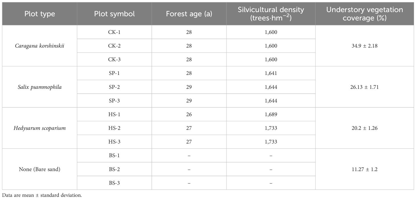 Although many vegetation- and soil-related studies have been conducted on plantation forests in arid areas, most of these studies have focused on one aspect of vegetation or soil. These have included studies on the impacts of sand-fixing measures on the physical, chemical and biological properties of soil (Pérez-Corona et al., 2021; Li et al., 2023a; Liang et al., 2023), or on the composition, diversity and physiological characteristics of vegetation (Khalilimoghadam and Bodaghabadi, 2020; He et al., 2021; Qianwen et al., 2022). However, the combined benefits of vegetation and soil for plantations in sandy areas are critical. Although C. korshinskii, S. psammophila and H. scoparium have been widely used in ecological restoration in the Kubuqi Desert, a systematic quantitative comparison of their overall benefits to ecosystem recovery is lacking, particularly regarding their relative effectiveness in promoting understory vegetation development and improving soil.