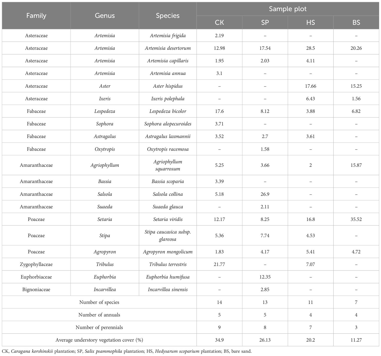 The total number of plant species and perennials in the different sites was in the order CK > SP > HS > BS. There were four dominant species in the CK plantations: Tribulus terrestris, Setaria viridis, perennial Lespedeza bicolor and Artemisia desertorum. There were three dominant species in the SP plantations: Salsola collina, Euphorbia humifusa and perennial A. desertorum. The HS plantation also had three dominant species: annual S. viridis and Aster hispidus, and perennial A. desertorum. The average cover of vegetation under different plantations was in the order CK > SP > HS > BS. There were more dominant species in the understory vegetation of CK plantations compared to the other plantations. The species composition of the SP and HS plantations was relatively simple.