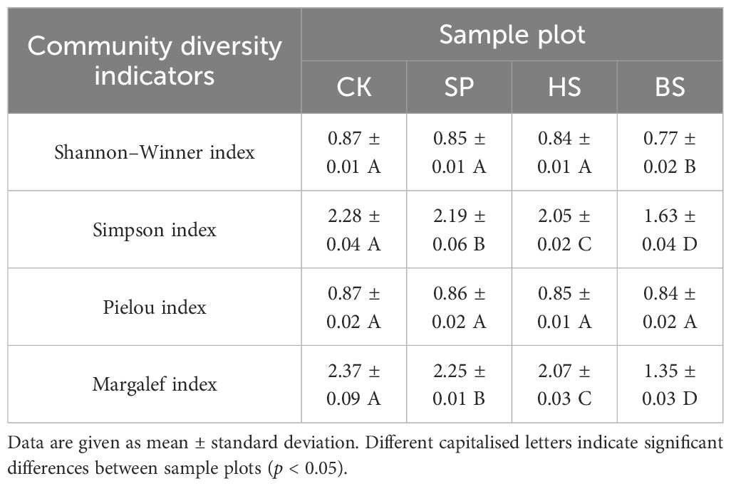 The importance value is used as an indicator of population dominance (Mensah et al., 2020). This was used to understand the distribution pattern and functional status of herbaceous vegetation species under different plantations. Based on previous species diversity research results (Kim et al., 2017; Mensah et al., 2020; Haq et al., 2024), the Simpson, Shannon-Wiener, Pielou and Margalef indexes were chosen to analyse the characteristics of species diversity of the vegetation communities in different types of sand-fixing plantations.