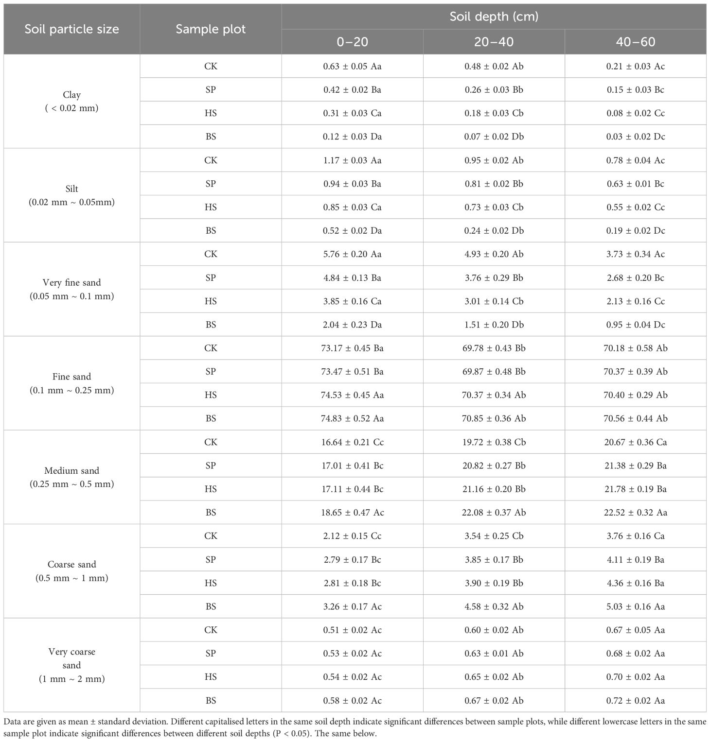 In this study, the analysis of the spatial distribution of soil physicochemical properties in the 0–60 cm soil layer revealed that all the plantations exhibited the highest content of fine particulate matter and nutrients in the 0–20 cm soil layer. This was in agreement with the findings of related studies by Li et al (Li et al., 2017, 2022). This may have been because the branches and leaves of the vegetation trapped fine dust particles in the air, which were then replenished on the soil surface through rainfall. Soil fine particles are the key sources of nutrient enrichment. None of the plantations selected for the present study had a significant effect on the very coarse sand content of the soil, probably because they were shrubs. Shrub forests only reduce wind speed at a height of 0–2 m (Pan et al., 2021) and have a limited inhibitory effect on the leapfrog movement of very coarse sand. Winds mainly carry medium and fine sands. The movement of very coarse sands requires wind speeds in excess of those needed for common wind erosion, making them difficult to redistribute via wind. Fine shrub roots form root-soil complexes mainly with < 0.25 mm particles (Lai et al., 2016), whereas very coarse sand is difficult to entangle by roots or bind by secretions because of its large particle size.