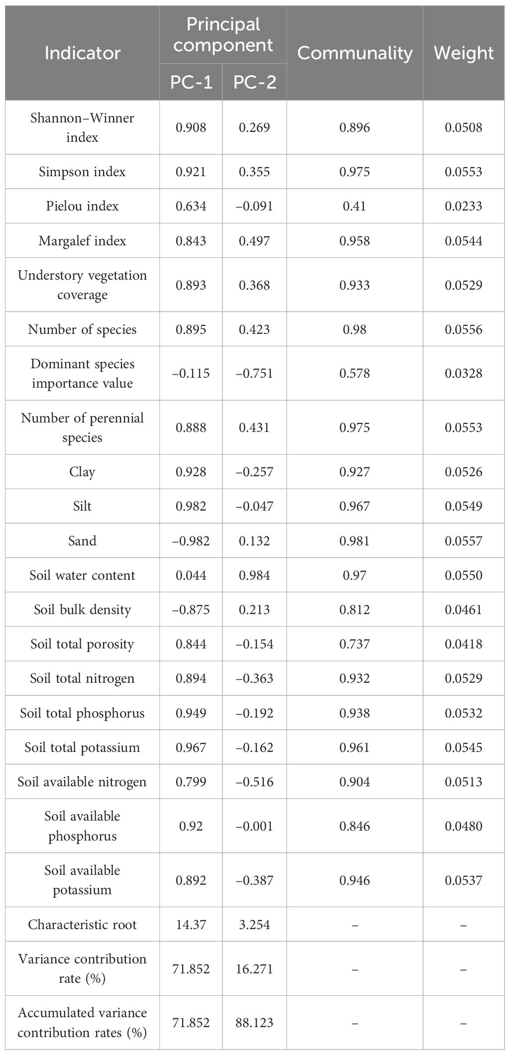 During the growth and development of plantation forests, understory vegetation has a significant influence on soil structure and nutrient cycling (Normand et al., 2017; Gatica-Saavedra et al., 2023). Studies have shown that the composition and diversity of understory vegetation directly or indirectly lead to changes in soil physicochemical properties (Ali et al., 2019; Han et al., 2024b). Plants also change the structure and function of soil through root distribution, canopy growth and the decomposition of apoplastic materials (Lozanova et al., 2019). Soil, as the basis for plant growth and survival, provides a location and medium for vegetation growth, and plays an inescapable role in the structure and function of plant communities (Kik et al., 2021; Sharma and Kumar, 2023). This mechanism of mutual influence and interaction between vegetation and soil is an essential link in controlling ecological processes (van der Putten et al., 2016). In arid and semi-arid regions, the development and restoration of understory vegetation soil often indicate the effectiveness of ecological reconstruction (Ayangbenro and Babalola, 2021).