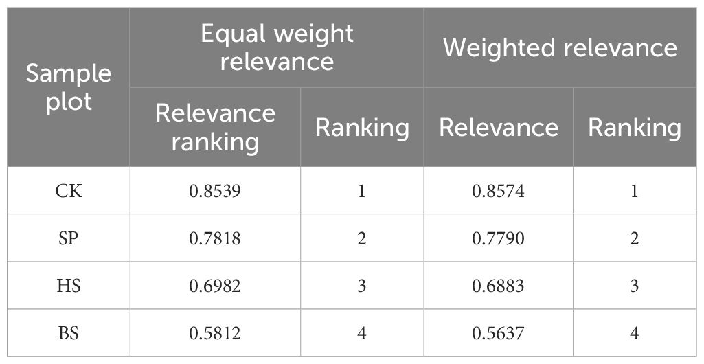 In GRA, equal weights cannot objectively reflect comprehensive evaluation results because they do not account for the varying degrees of influence among indicators. Therefore, a weighted analysis considering indicator weights is typically required. PCA was performed on the normalised vegetation and soil system indicators (Table 5), yielding two principal components with eigenvalues >1 and a cumulative contribution rate of 88.123%. The indicator weights for GRA were determined based on the variance contribution rate of each indicator. The evaluation results of the equal weights and weighted GRA (Table 6) followed the order CK > SP > HS > BS.