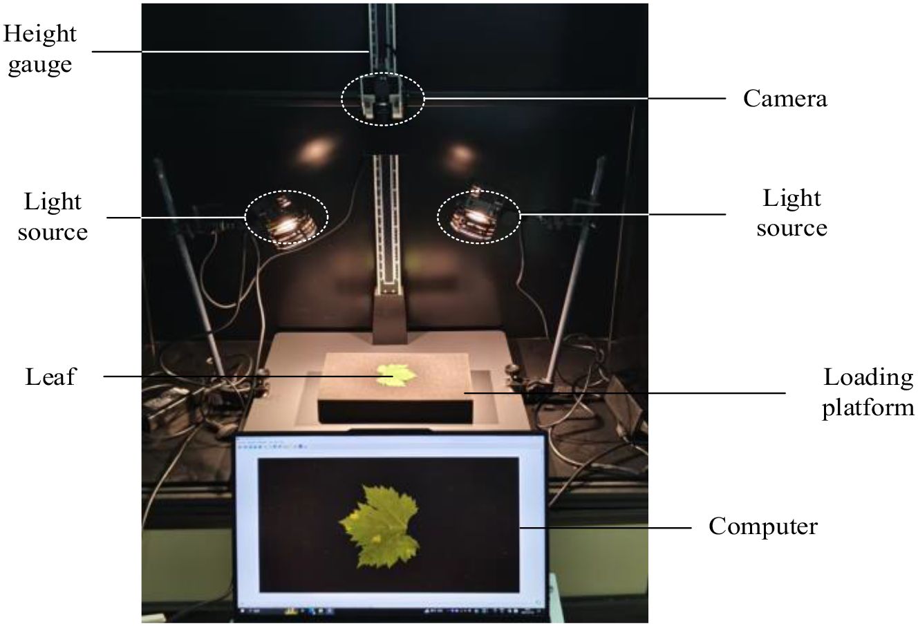 To investigate lesion characteristics and develop grading methods for grape downy mildew, we collected RGB images of detached grape leaves infected with the disease. Early-stage disease images were collected at the Xiaotangshan National Precision Agriculture Research Demonstration Base in Beijing, and late-stage images were collected at the Chateau Bolongbao Winery in Fangshan, Beijing. The image-acquisition system consisted of an MV-SUA505GM camera equipped with an MS3M008 lens at a working distance of 50 cm. The resulting dataset comprised downy mildew leaf images from five grape varieties: Wild Grape, Kyoho, White Grape, Ningxia Wild Grape, and Cabernet Sauvignon. A total of 674 RGB images were collected, including 430 early-stage and 244 late-stage images. Each image had an original resolution of 2592 × 2048 pixels. Figure 1 shows an overview of the image acquisition system.