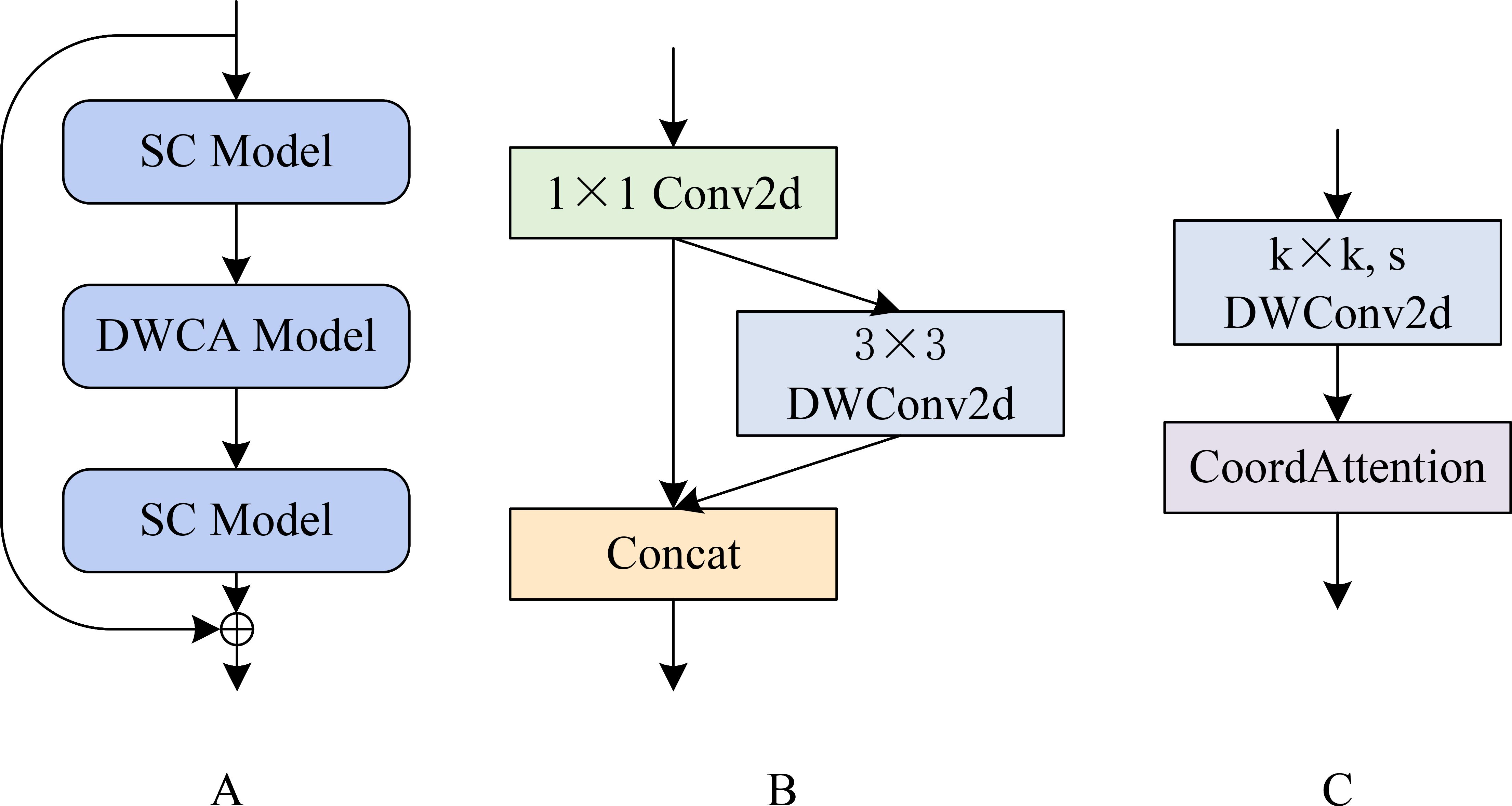 Figure 2A shows that the SCDCA Model comprises a series of stacked modules. The processing pipeline involves three main components executed in sequence: a separable convolution (SC) module (Figure 2B), followed by a depth-wise convolution with depth-wise coordinate attention (DWCA) module (Figure 2C), and a final SC Model. A skip connection is established by directly connecting the input of the first SC module to the output of the final SC module. This architectural design integrates modular processing with skip connections, effectively leveraging complementary advantages to enhance the capacity of the model for learning and processing complex features.