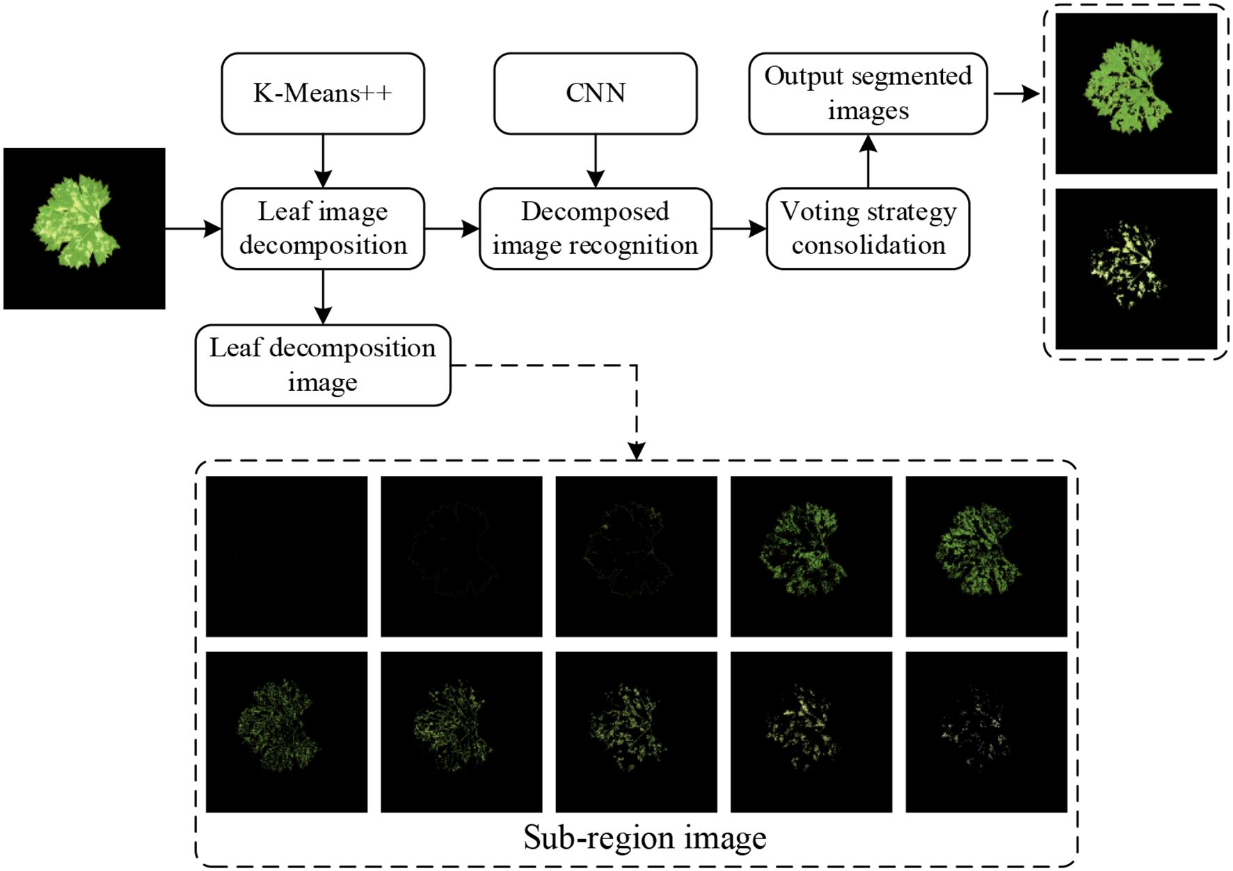 Owing to the morphological complexity of grapevine downy mildew symptoms, manual pixel-level annotation is both labor-intensive and resource-demanding, making direct label-based training infeasible. Traditional image processing or unsupervised learning methods require manual identification of extractable features across massive datasets to design segmentation rules. Furthermore, variations in leaf brightness, uneven illumination, and divergent lesion characteristics across severity levels render manual feature extraction extremely challenging. To overcome these challenges, we propose a hybrid lesion segmentation method that combines K-means++ clustering with CNN-based classification (K-CNN-VC method), enabling efficient and automated lesion area identification with minimal supervision. Unsupervised learning first decomposes images into sub-regions with homogenous color features, while supervised training classifies these sub-regions. Issues such as potential misclassifications are corrected using voting consolidation. Finally, sub-regions are recombined to identify lesions and leaf areas. This approach indirectly applies supervised learning to automated lesion feature extraction, as illustrated in Figure 3.