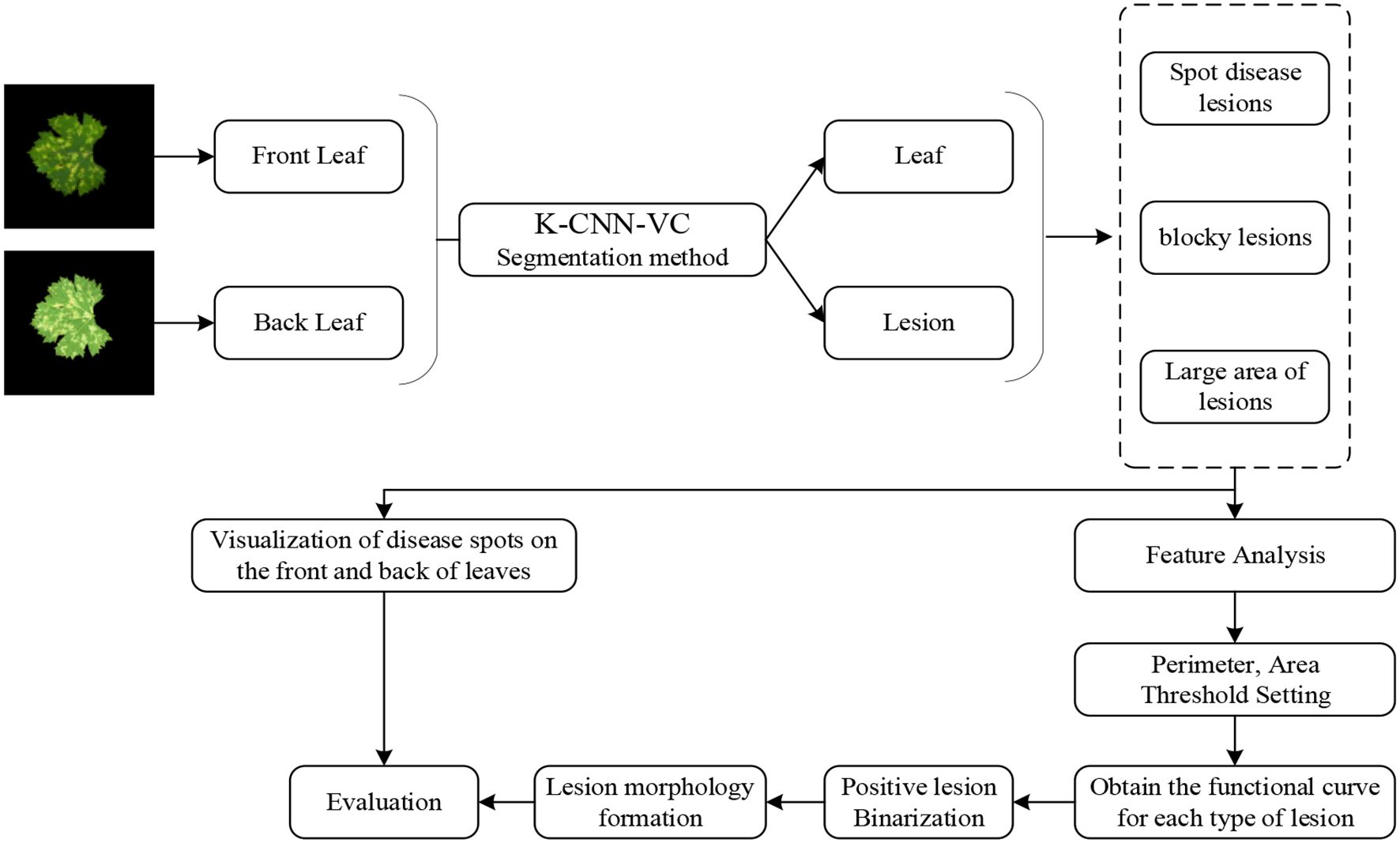2. To propose the K-CNN-VC lesion segmentation method for precise quantitative analysis of lesion areas. This method segments leaf sub-images via K-Means++, classifies them using the grading network, and consolidates them through voting, thereby addressing the time-consuming and imprecise manual annotation of complex lesions.