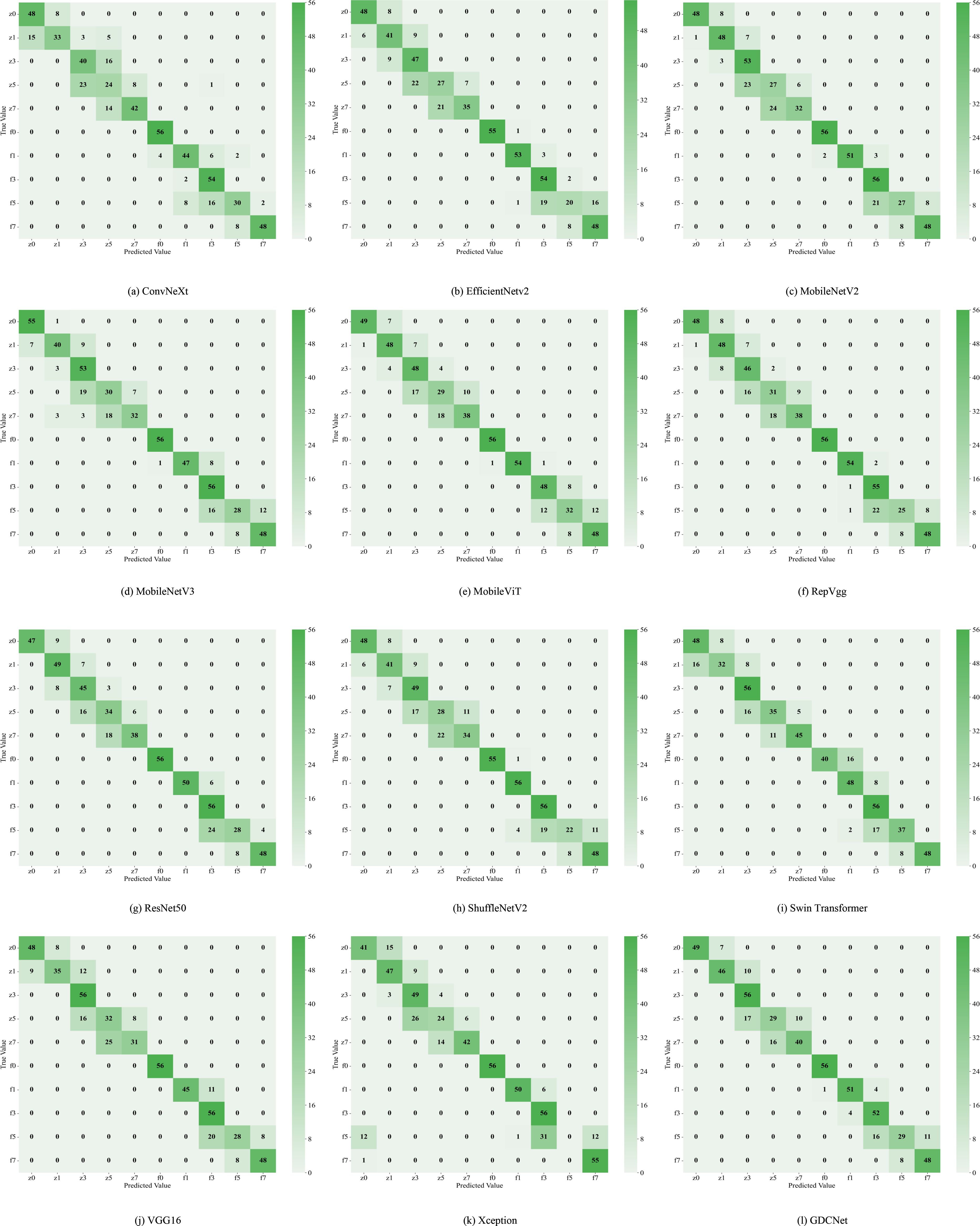 Figure 5. Twelve types of network classification confusion matrices. (a) displays the classification confusion matrix of the ConvNeXt network; (b) displays the classification confusion matrix of the EfficientNetV2 network; (c) displays the classification confusion matrix of the MobileNetV2 network; (d) displays the classification confusion matrix of the MobileNetV3 network; (e) displays the classification confusion matrix of the MobileViT network; (f) displays the classification confusion matrix of the RepVgg network; (g) displays the classification confusion matrix of the ResNet50 network; (h) displays the classification confusion matrix of the ShuffleNetV2 network; (i) displays the classification confusion matrix of the Swin Transformer network; (j) displays the classification confusion matrix of the VGG16 network; (k) displays the classification confusion matrix of the Xception network; (l) displays the classification confusion matrix of the GDCNet network.