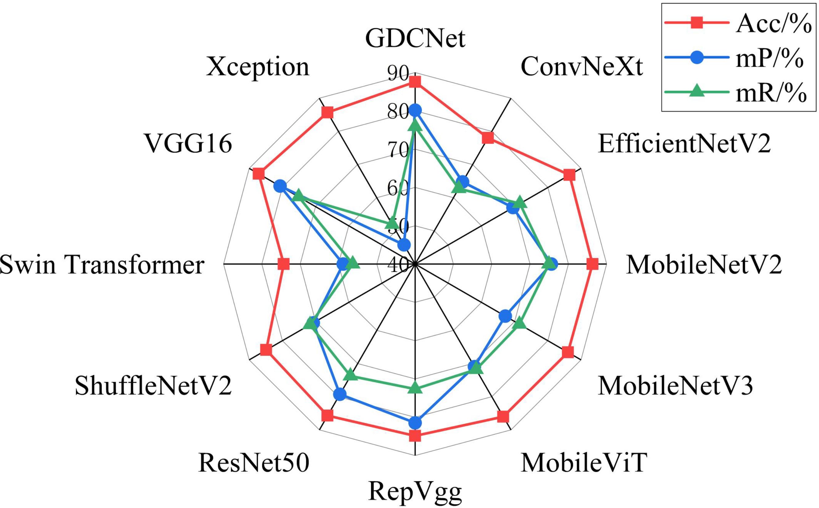 GDCNet consistently ranked among the top performers, achieving 87.57% accuracy and 80.17% mP, while maintaining a balanced performance across both structural (for example, adaxial/abaxial veins) and composite categories (such as lesions with veins), indicating enhanced sensitivity to disease-specific traits. RepVgg and ResNet50 demonstrated strong performance in terms of mean recall and precision, benefiting from residual connections and reparameterization that enhance feature robustness in complex backgrounds. Xception achieved zero accuracy in vein-related categories, indicating that its depthwise separable convolution structure is unable to integrate fine-grained multimodal cues.