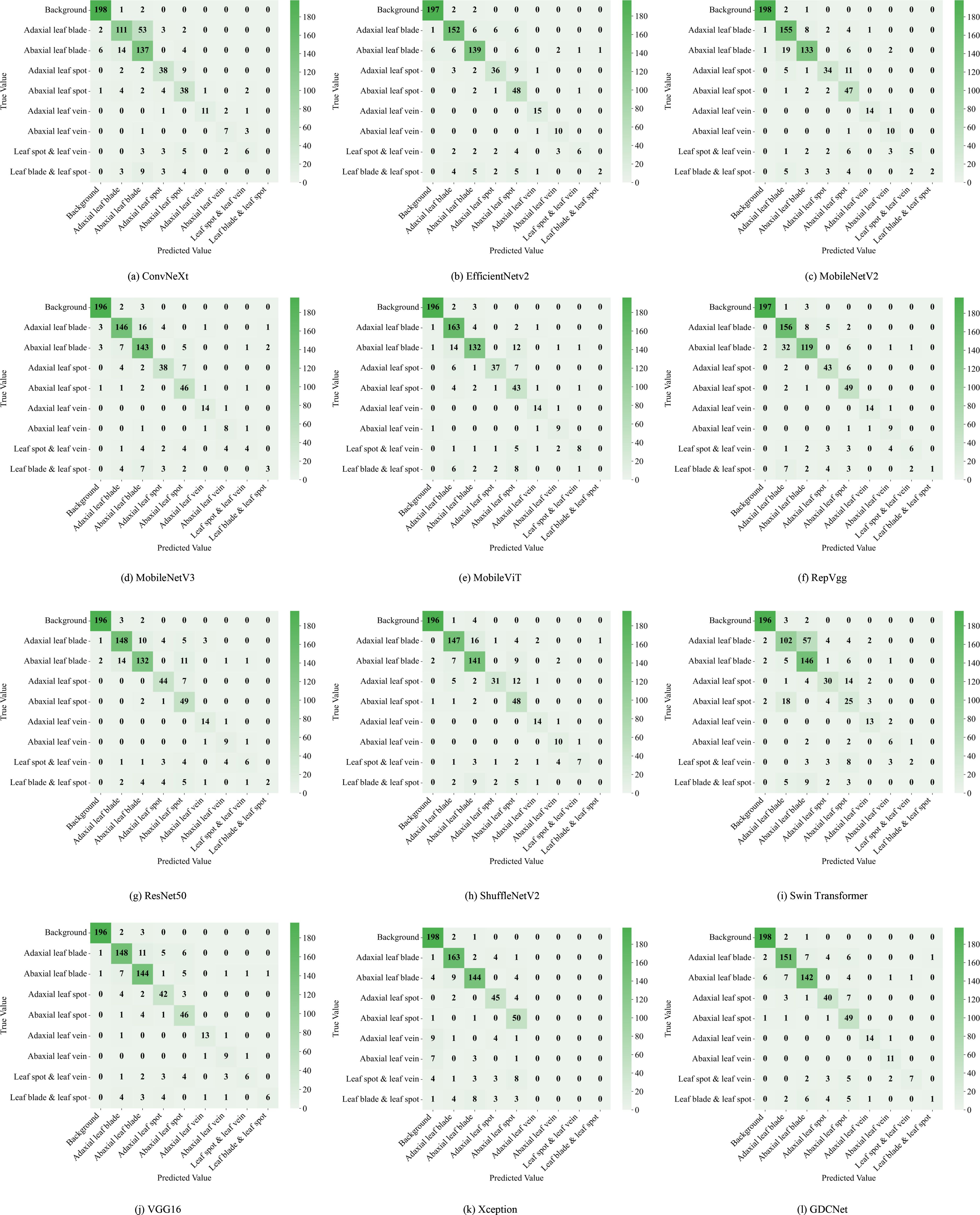 Among all models, MobileViT demonstrated superior performance in identifying abaxial leaf surfaces, adaxial lesions, and lesions with veins. This effectiveness can be attributed to its hybrid architecture, which combines the global modeling of Vision Transformers with the spatial local feature extraction of convoluted networks. This likely captures cross-regional dependencies in leaf textures and lesion morphologies. VGG16, a deep convolutional architecture, exhibited high accuracy for background adaxial leaf surfaces, and leaves with lesion categories, but underperformed in categories involving abaxial lesions and veins, highlighting its limitations in capturing fine-grained, low-contrast structures on the leaf underside. Similarly, Swin_Transformer struggled with lesions and veins, potentially due to its local window-based attention strategy, which led to contextual fragmentation in overlapping semantic regions.