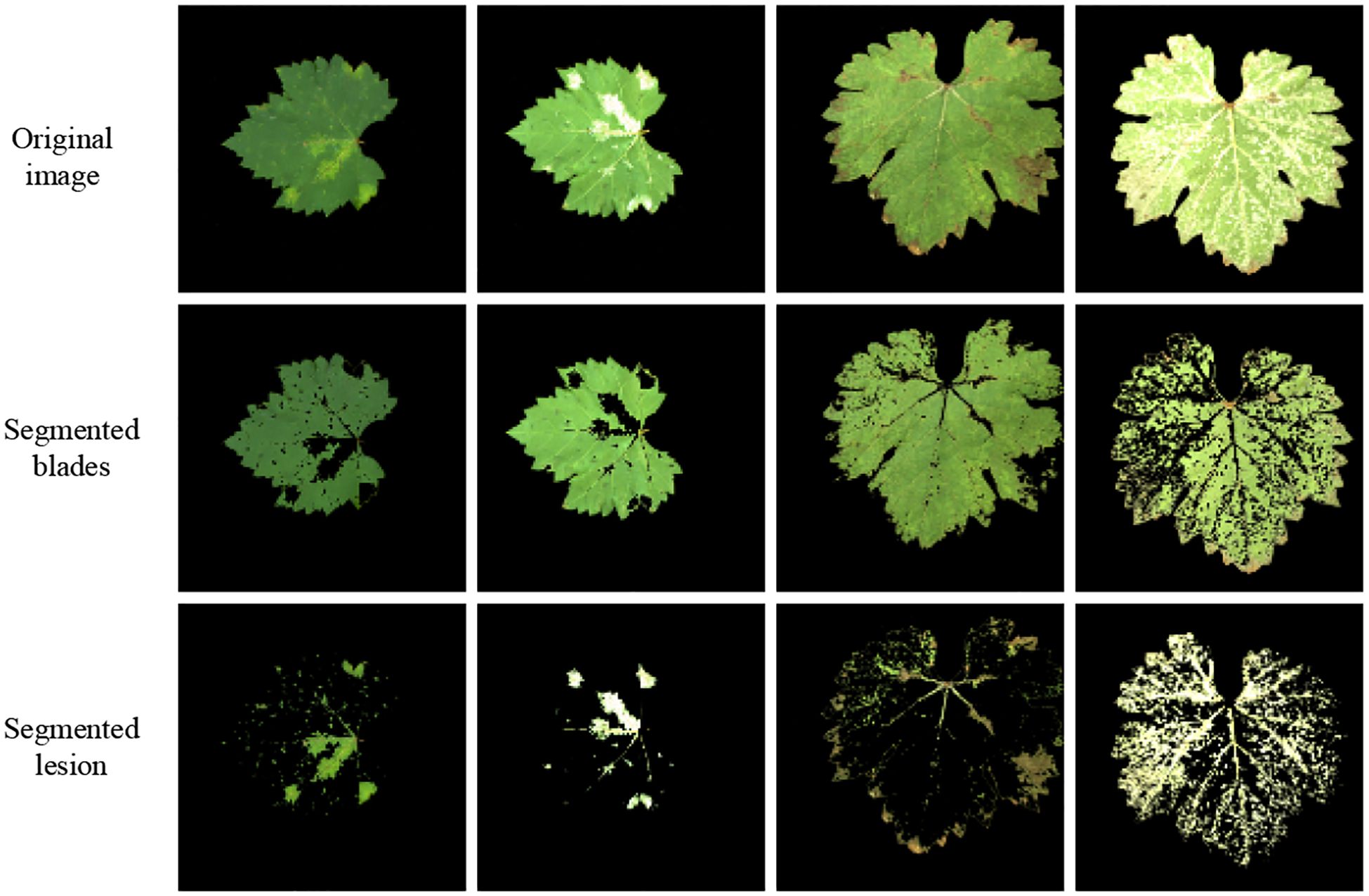 Grapes, known for their sweet-sour taste and rich nutritional content, are among the most widely consumed fruits globally (Tian et al., 2018; Liu et al., 2020). They represent a globally significant economic fruit crop, and the quality of grapes and their related processed products is vital to the stability of the agricultural economic chain (Sagar et al., 2025). Grapevines are frequently affected by diseases during growth, among which grape downy mildew—an airborne oomycete disease—poses a severe threat to leaf photosynthetic efficiency and fruit development (Ting et al., 2025; Wu et al., 2025). Infected fruits exhibit a deteriorated appearance and flavor, and fail to meet the standards for fresh consumption or winemaking. Grapevine downy mildew is highly epidemic, and once it erupts, it becomes difficult to control. Surveys indicate that outbreaks can reduce annual grape yields by 11.8%–25.9%, making them a critical biotic stress factor that limits grape quality improvement and economic development (Wang and Li, 2024). The epidemic period of grapevine downy mildew is closely linked to climatic conditions. In North China, symptoms typically emerge sporadically in July, presenting as irregular pale-yellow water-soaked spots on the adaxial leaf surface, with sparse, characteristic white downy mildew layers on the corresponding abaxial areas. The lesion edges on both sides are generally indistinct (Wang et al., 2022a). As autumn rains increase, the disease enters an explosive phase in August. Adaxial lesions rapidly enlarge, turning yellow-brown to dark brown, while abaxial mildew layers become dense and thick, transitioning from white to gray with a “white, frost-like” appearance, yet still retaining blurred edges (Liu et al., 2022). By September, late-stage symptoms manifest as irregular desiccation cracks and perforations due to tissue necrosis on the adaxial surface, whereas abaxial surfaces show sparse grey mildew spots that significantly reduce photosynthesis (Yu et al., 2024). The current integrated management of grapevine downy mildew relies primarily on chemical control (Wang et al., 2022). However, extensive chemical spraying methods result in excessive pesticide residue and environmental pollution, highlighting the need for severity grading to enable differentiated precision control.