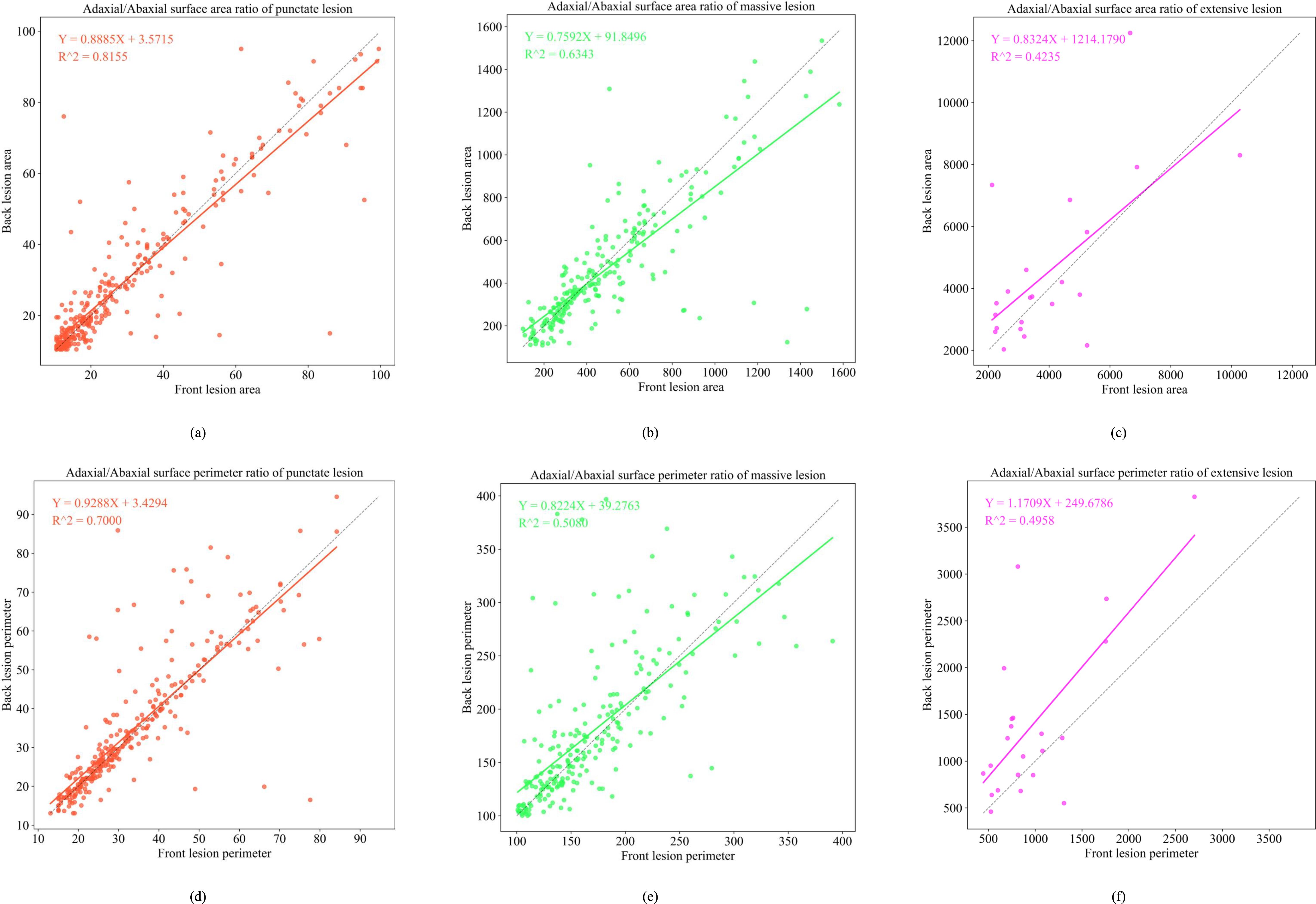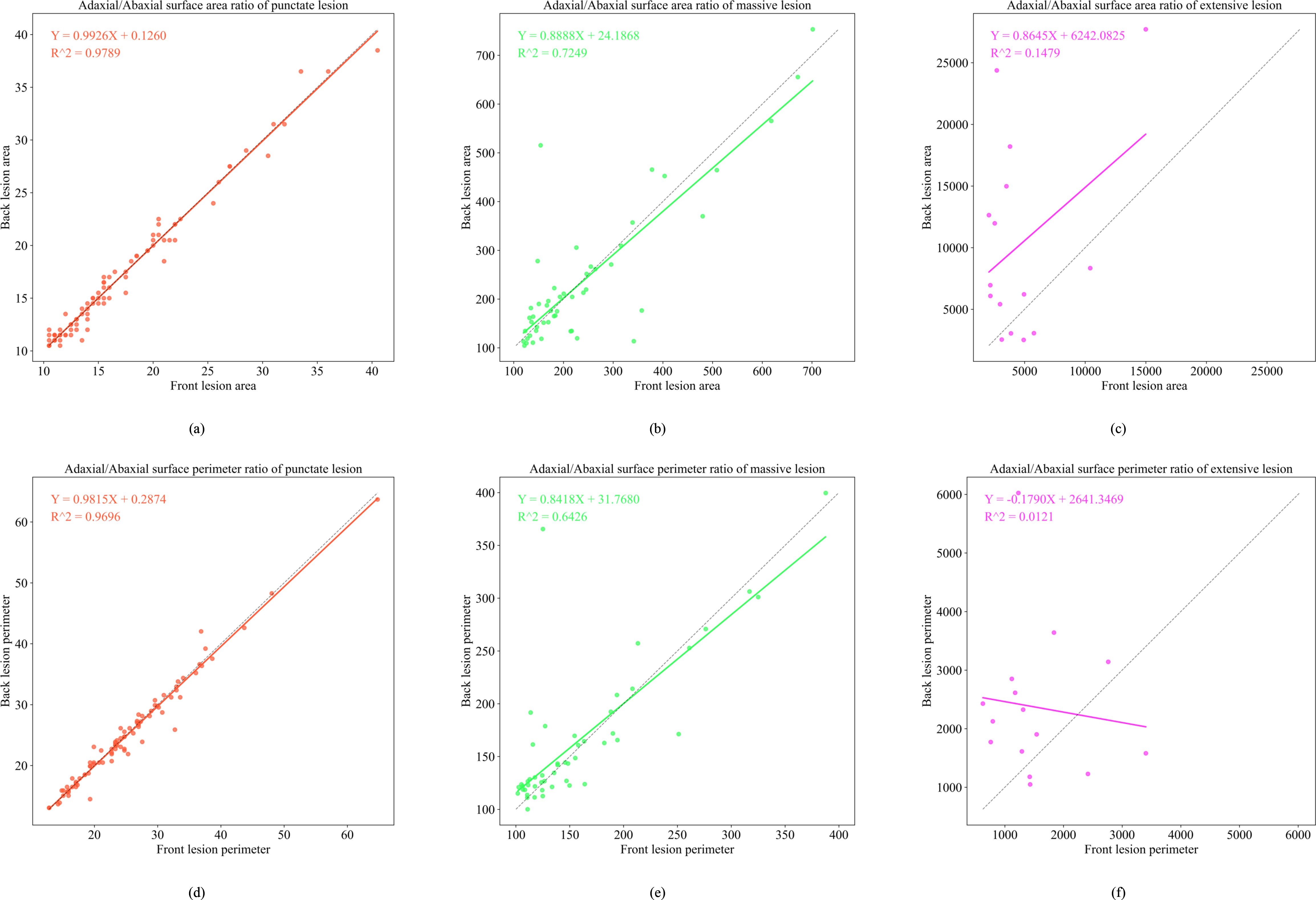 Figure 10. Functional relationship diagram of the front and back sides of three early-stage lesion types. (a) depicts the adaxial/abaxial surface area ratio of punctate lesion; (b) depicts the adaxial/abaxial surface area ratio of massive lesion; (c) depicts the adaxial/abaxial surface area ratio of extensive lesion; (d) depicts the adaxial/abaxial surface perimeter ratio of punctate lesion; (e) depicts the adaxial/abaxial surface perimeter ratio of massive lesion; (f) depicts the adaxial/abaxial surface perimeter ratio of extensive lesion.