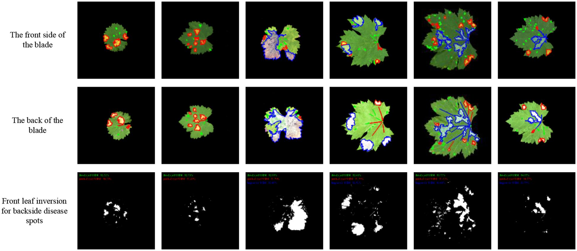 The characteristic symptoms of grapevine downy mildew manifest predominantly on the abaxial leaf surface, and disease severity grading typically relies on the proportion of the abaxial lesion area. However, under natural conditions, grape leaves predominantly exhibit an adaxial-facing orientation. Manual detection requires leaf flipping, which entails high labor intensity and subjectivity (Hernández et al., 2024). Similarly, images captured by inspection-spraying robots primarily feature adaxial surfaces, leading to detection inaccuracies. Consequently, spraying decisions derived from such data may result in dosage deviations, increasing the risk of fungicide resistance and potential environmental contamination due to over-application (Jin et al., 2022). Therefore, developing adaxial-to-abaxial lesion inversion methods is crucial. Zhang et al. (2019) acquired both adaxial and abaxial images of wheat ears, processed them through grayscale conversion and binarization, calculated the lesion-to-ear area ratio, and graded the severity of Fusarium head blight based on national standards. Although this method integrates adaxial-abaxial disease information, it does not separately compare severity levels against national criteria. Yang (2020) utilized ResNet50 to identify pear leaf diseases (brown spots, black spots, and rust) on adaxial and abaxial surfaces, achieving recognition accuracies of 96.67% and 96.19%, respectively. Wayama et al. (2024) collected adaxial/abaxial images of diseased leaves from tomatoes, strawberries, cucumbers, and eggplants, employing EfficientNet for classification. The model achieved 95.2% accuracy in consistent environments but only 36.5% in varying environments. This study addressed cross-environment generalizability but ignored adaxial-abaxial symptom differences. These approaches overlook the symptomatic distinctions and correlations between the adaxial and abaxial surfaces, limiting their research scope and applicability. Therefore, it is essential to investigate whether adaxial and abaxial lesion severity align quantitatively, analyze correlations when inconsistencies exist, and leverage these relationships to infer abaxial lesions from adaxial images, thereby obtaining accurate disease severity grades and achieving adaxial-to-abaxial lesion inversion.
