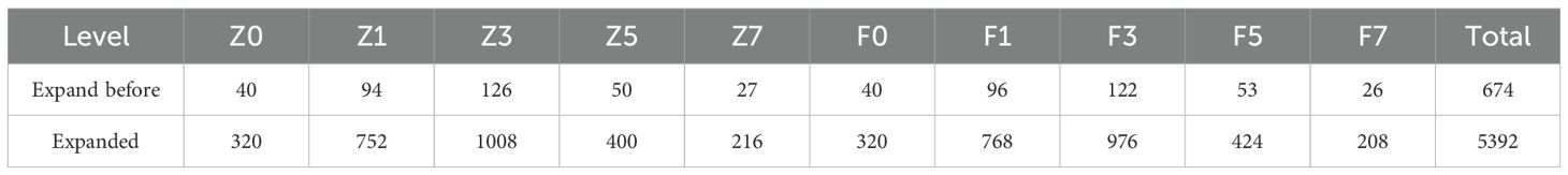 The original images were initially center-cropped to a resolution of 1024 × 1024 pixels and subsequently downsampled to 512 × 512 pixels. To address the challenges posed by an insufficient number of grapevine downy mildew leaf samples and imbalanced distribution of severity levels, we applied data augmentation techniques (González et al., 2025) to enhance model generalization and reduce overfitting during training. Using geometric transformations such as rotation and flipping, we expanded the dataset to a total of 5,392 images, forming the Grape Downy Mildew Image Dataset (GDCData). This dataset was divided into training, validation, and test sets in a 7:2:1 ratio. Table 1 shows the representative augmentation results, where z0 denotes adaxial healthy leaves, z1–z7 represents adaxial lesion severity grades, f0 indicates abaxial healthy leaves, and f1–f7 signifies abaxial lesion severity grades.