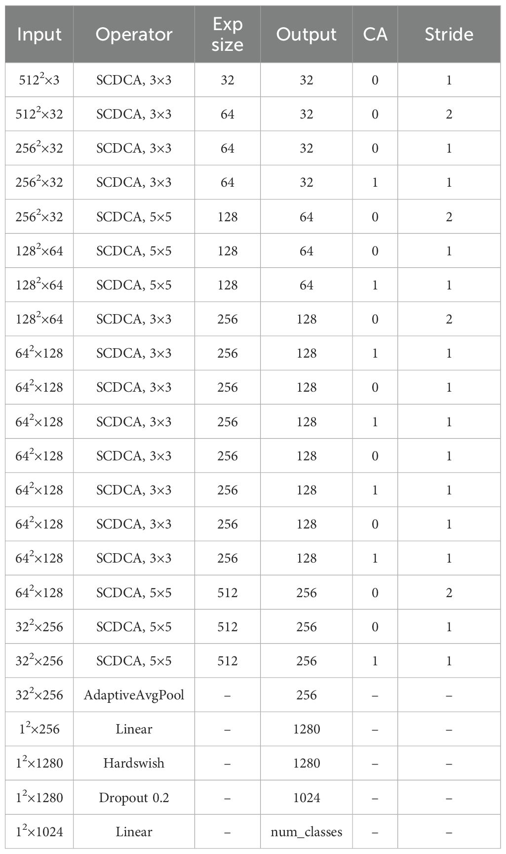 The SC Model begins by applying a 1 × 1 two-dimensional convolution to the input feature map. The resulting feature map is then split into two parallel processing paths: one path bypasses further processing directly, and the other path is processed through a 3 × 3 depthwise separable convolution, as described by Tang et al. (2020). These outputs from both paths are concatenated to form the final output of the SC module. This dual-path architecture facilitates multiscale feature extraction and fusion, thereby enhancing the ability of the network to represent and differentiate fine-grained lesion features.