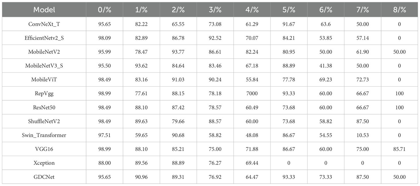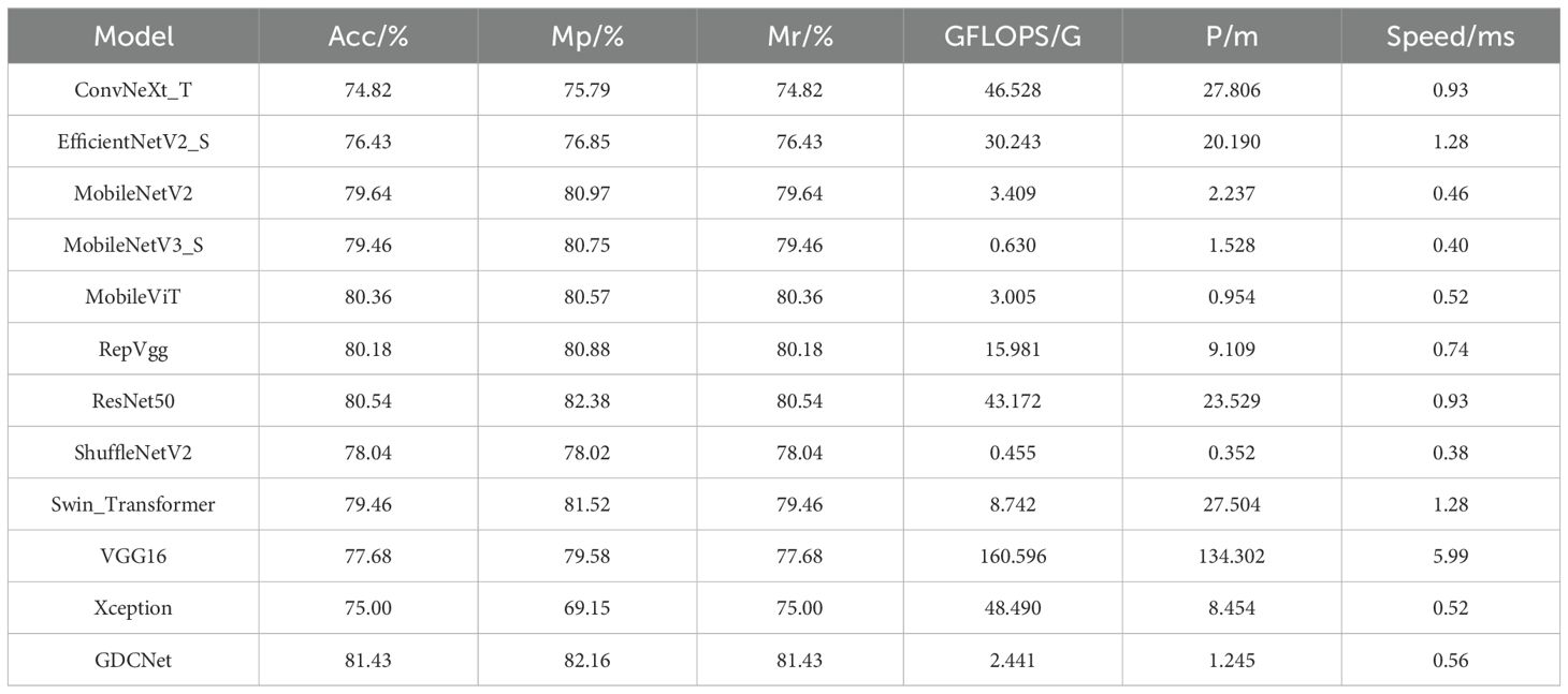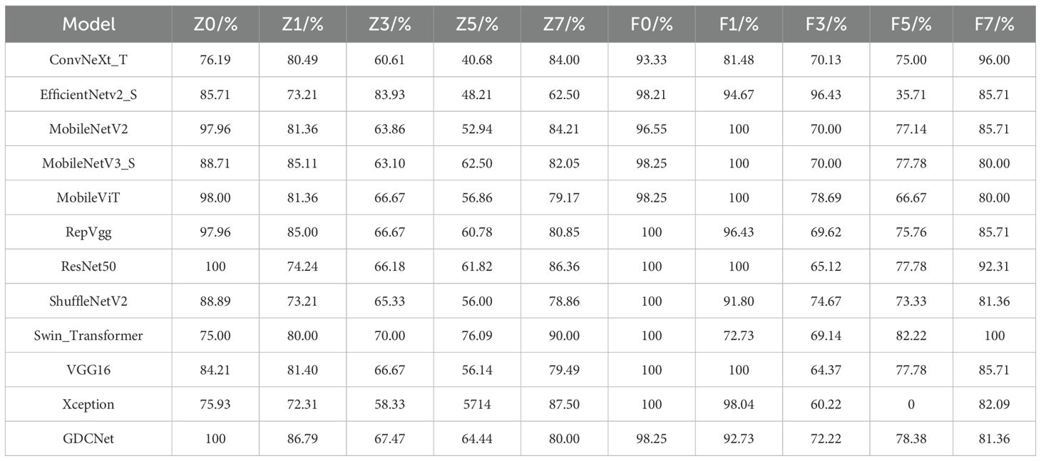 To evaluate the effectiveness of our GDCNet grading model, we conducted a comparative analysis involving twelve vision models on tasks involving the detection of adaxial/abaxial leaf health states (z0/f0), classification of multiple disease severity levels, and overall model performance (Acc, mP, mR, giga floating point operations (GFLOPS), parameter scale P/M, and inference speed). The results are presented in Tables 3, 4 and Figure 5. Based on category-specific accuracy, ResNet50, RepVGG, and VGG16 achieved 100% precision in detecting adaxial healthy leaves. Additionally, ResNet50, RepVGG, ShuffleNetV2, and others also achieved perfect classification, indicating a strong discriminative capability for disease-free samples. Conversely, Xception performed poorly on high-severity grades (such as z3 and f5), with complete failure in f5. This reflects that its feature extraction mechanism is inadequate for complex disease morphologies. The specialized model GDCNet achieved exceptional performance in z0 and z1 categories (early-stage adaxial lesions), surpassing most general models in fine-grained early disease classification. This indicates that its optimized design effectively enhances fine-grained classification for early-stage disease features. Lightweight models, such as MobileNetV3_S and MobileViT, achieved 100% accuracy in F1, revealing sensitivity to superficial features of low-grade infections. Conversely, Swin_Transformer and GDCNet performed relatively better in severe disease grades.