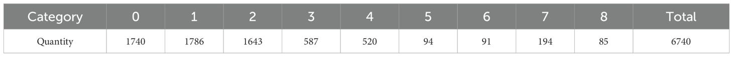To construct a robust segmentation dataset for grape downy mildew, we employed the proposed K-CNN-VC segmentation method on a total of 6,740 leaf images. The pipeline applied K-means++ clustering to decompose each image into sub-regions based on consistent color features, constructing the GDSData segmentation dataset. Table 5 details the categorization results. The training, validation, and test sets were distributed in a 7:2:1 ratio, where 0 denotes background, 1 denotes adaxial leaf surface, 2 denotes abaxial leaf surface, 3 denotes adaxial lesions, 4 denotes abaxial lesions, 5 denotes adaxial veins, 6 denotes abaxial veins, 7 denotes lesions and veins, and 8 denotes leaves and lesions.