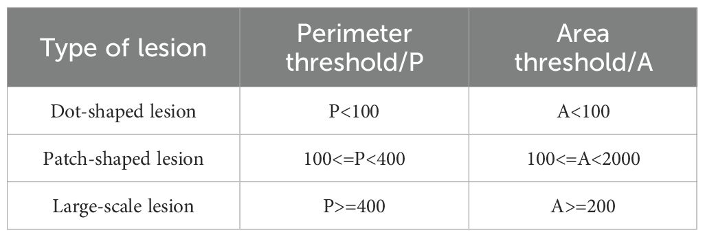 The classification results, based on the thresholds defined in Table 7, are presented in Figure 9. In Figure 9, green indicates typical dense and minute dot-shaped lesions, red denotes typical patch-shaped lesions, and blue denotes typical large-scale lesions.