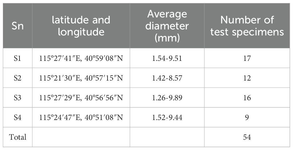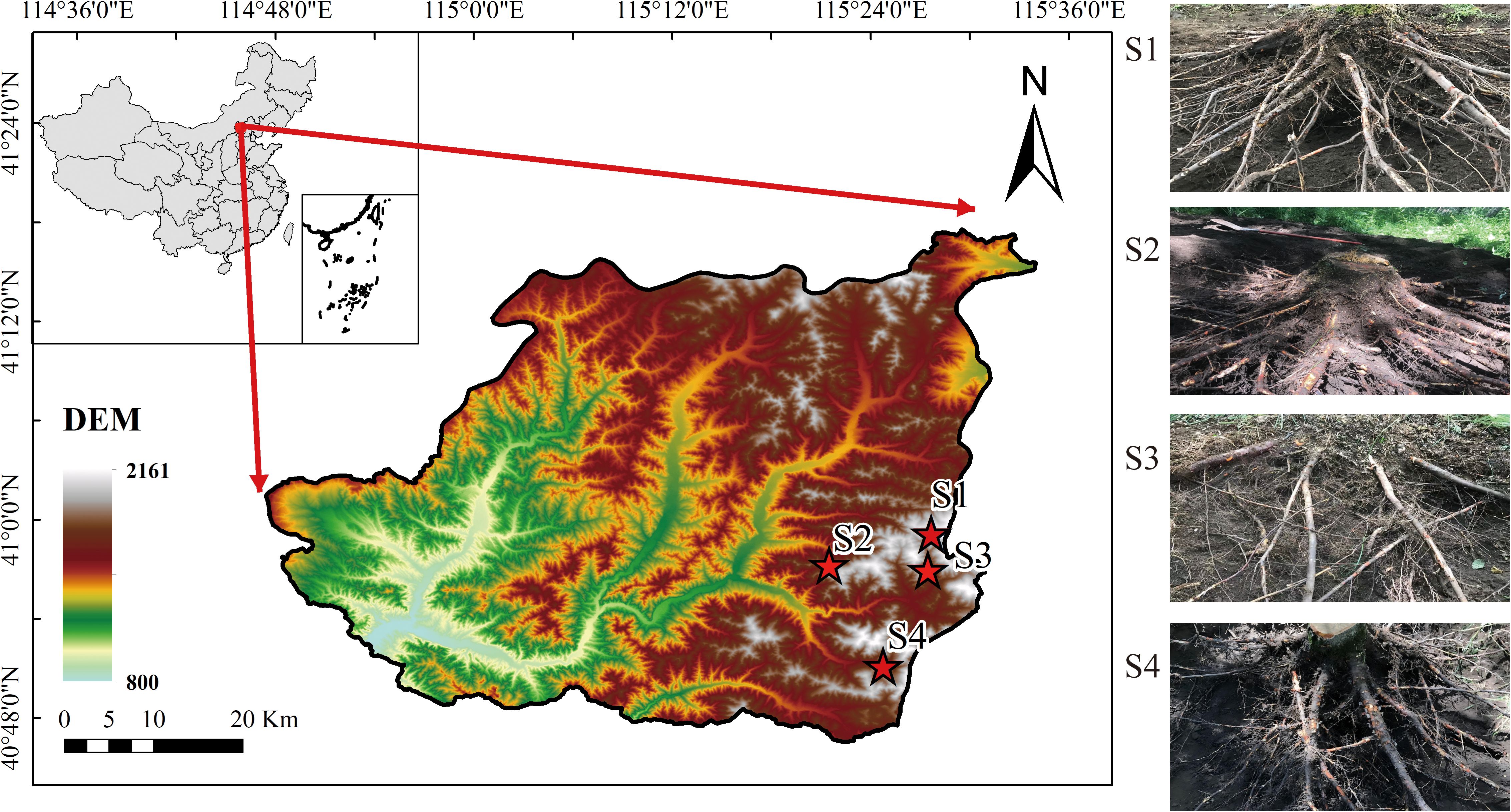 The study area is situated in the Taizicheng River basin within Chongli District, Zhangjiakou City, Hebei Province, covering a total area of 232.94 km². As illustrated in Figure 1, four sample points were selected and labeled as S1, S2, S3, and S4. The elevation of the area ranges from 1200 m to 2000 m, characterized by relatively rugged terrain. The region experiences an East Asian continental monsoon climate, where the average annual precipitation amounts to 482.4 mm and the annual average temperature is 3.81°C. Precipitation is highly unevenly distributed, with 75%–80% of the total annual rainfall occurring between June and September. The soil types in the study area are predominantly brown soils. Vegetation types fall within the warm temperate coniferous and deciduous broadleaf forest zone and the temperate grassland zone. The dominant vegetation is Betula platyphylla, with other tree species such as Larix principis-rupprechtii, Picea wilsonii, and Armeniaca sibirica also growing in the area. Betula platyphylla is widely distributed in northern China and is the dominant tree species in the study area. Previous studies have shown that Betula platyphylla roots exhibit superior tensile properties under similar conditions (Li X. et al., 2022). Furthermore, surveys within the study area revealed that Betula platyphylla forests had the highest soil fauna density and number of groups, as well as the highest Shannon-Wiener, richness, and evenness indices (Zhang et al., 2022). This suggests that Betula platyphylla forests possess high stability and diversity in their soil fauna, which could contribute to ecological restoration after slope planting. Overall, Betula platyphylla is the most suitable species.