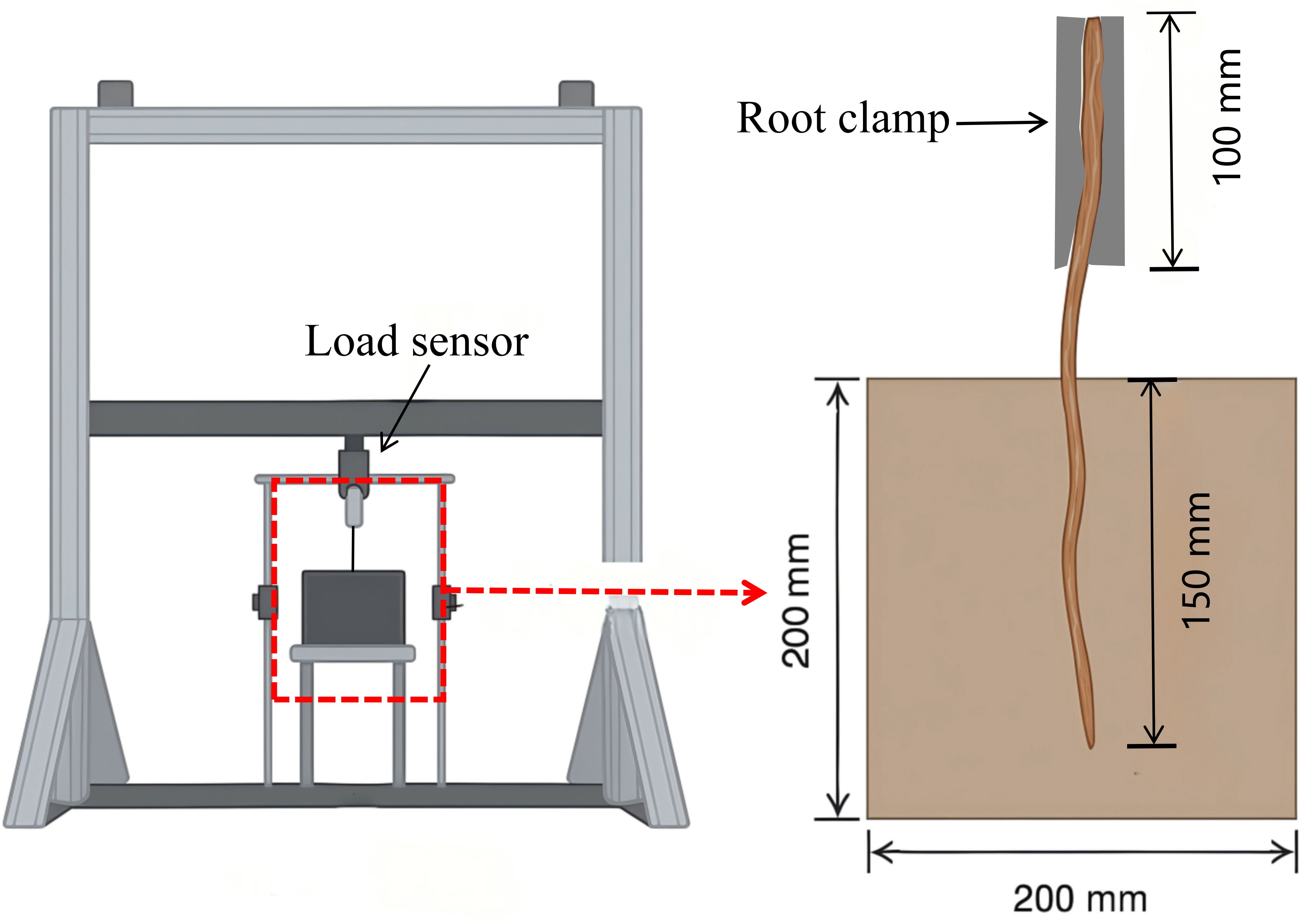 The anchorage capacity of a root system can be defined as the extent to which roots resist and adapt to mechanical forces transmitted through the plant structure (Niklas, 1999; Stubbs et al., 2019). Traditionally, this capacity has been evaluated through monotonic pullout tests, which apply steadily increasing tensile forces until failure, capturing peak resistance under extreme loading scenarios such as landslides or mudflows (Ji et al., 2018; Zhu et al., 2022). However, such events are rare. In natural settings, roots are more commonly exposed to repeated cyclic loads, including wind-induced swaying and runoff-driven erosion. Representing these as cyclic loading offers a more realistic approach for assessing in situ anchorage performance.