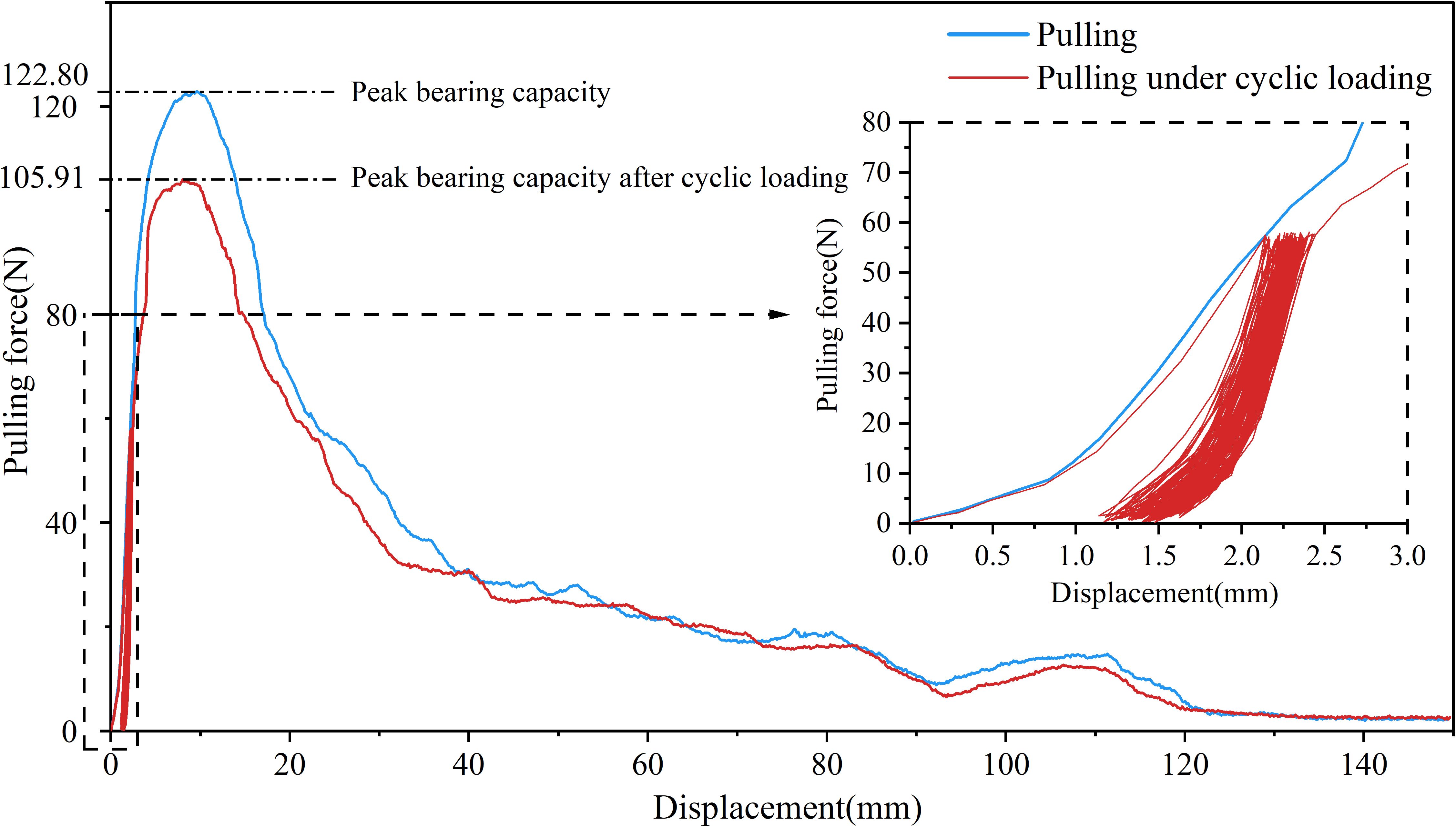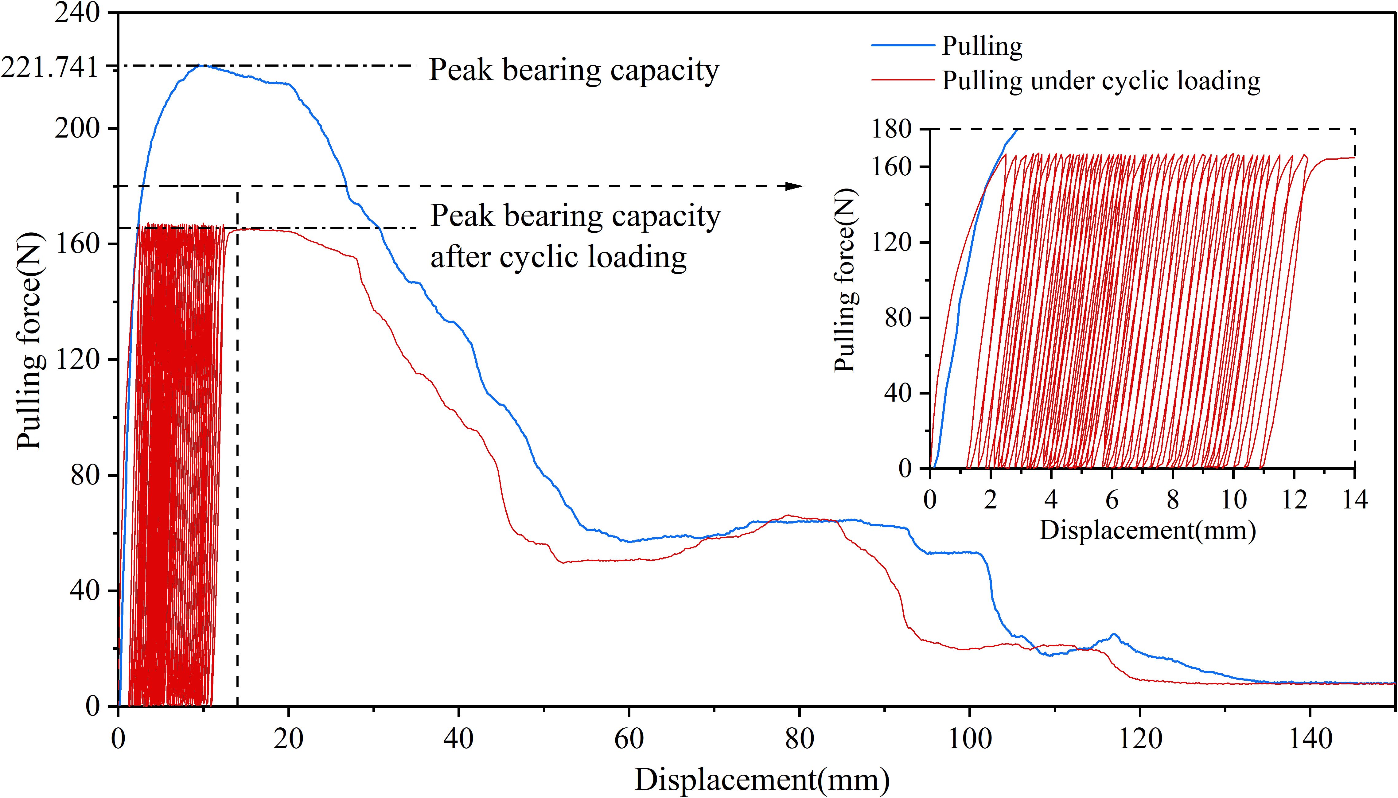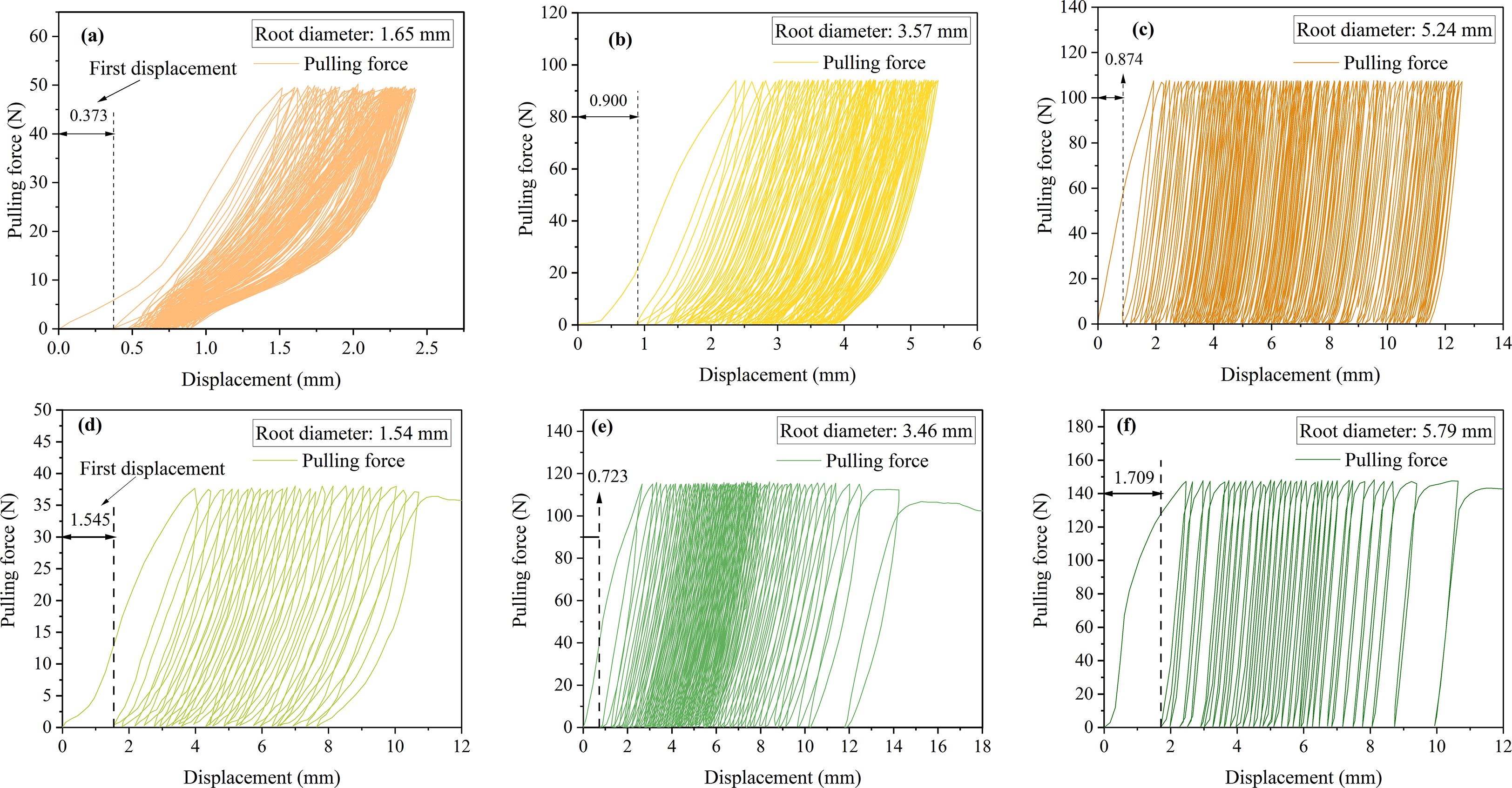 Methods: A series of pull-out tests were performed on soil-embedded roots, including monotonic pull-out tests and 100 cycles of loading and unloading.