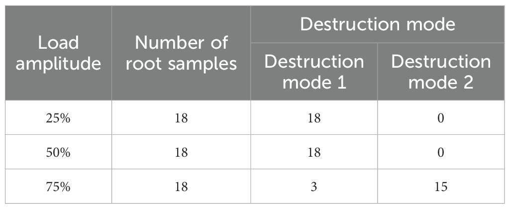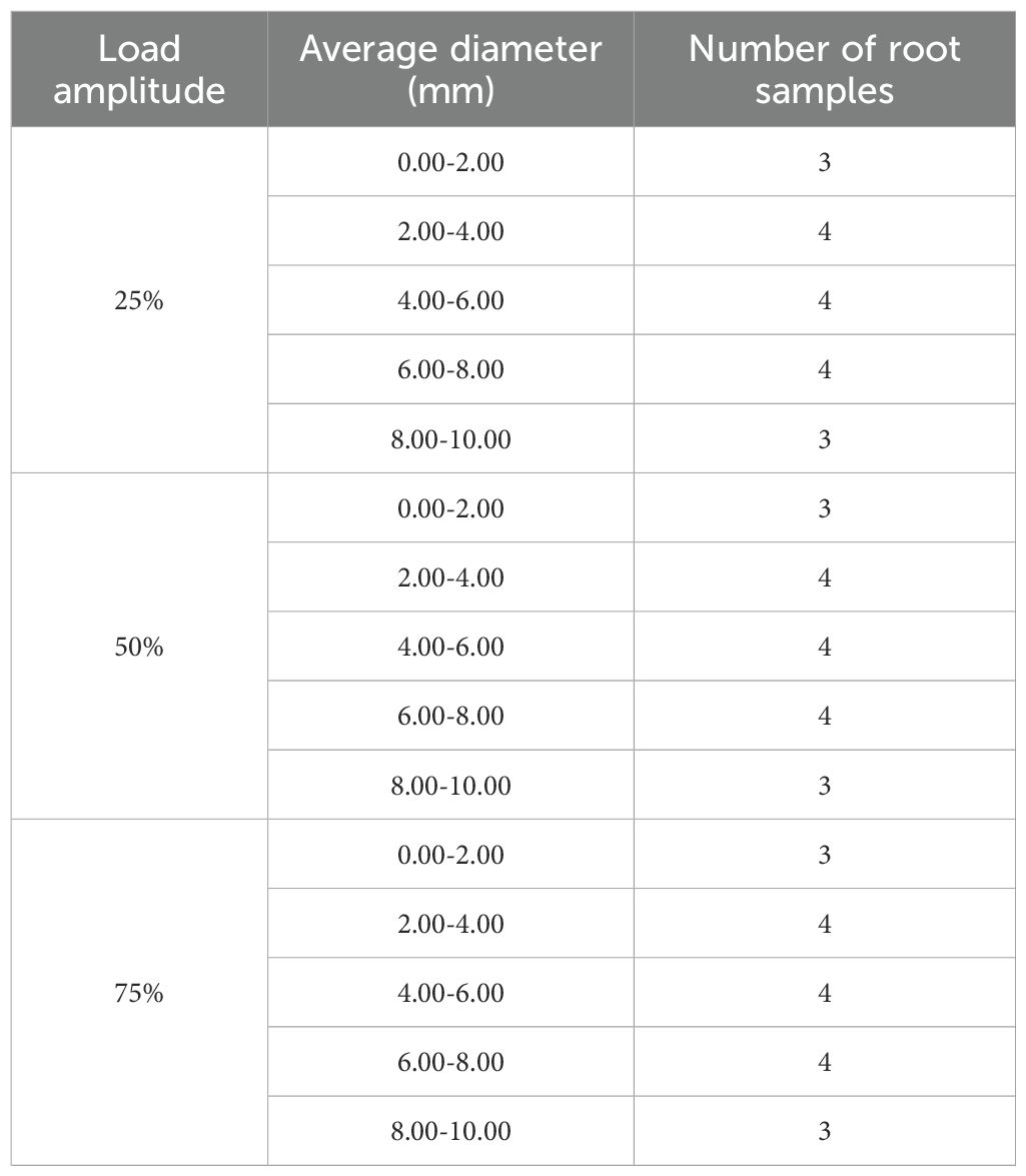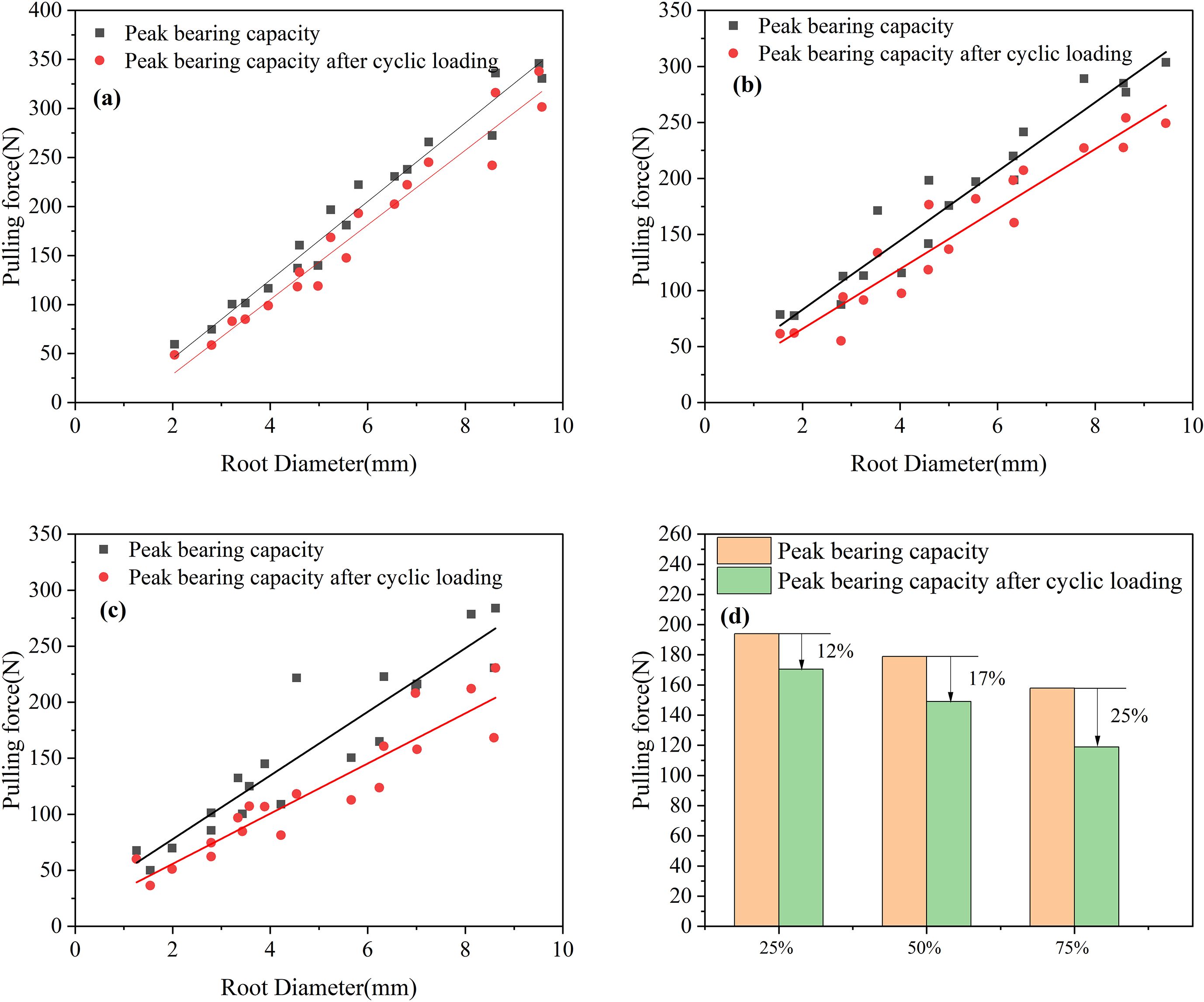 In this experiment, under cyclic load amplitudes of 25% and 50%, roots were completely extracted after 100 loading-unloading cycles, with peak bearing capacity decreasing by 12.07% and 16.73%, respectively. Under a 75% cyclic load, three roots were pulled out after completing 100 cycles, while fifteen roots failed before reaching 100 cycles. Fatigue theory in materials science offers valuable insights into this behavior. Basquin’s law (Kun et al., 2008) posits that the fatigue life of a material under cyclic loading follows a power-law relationship with stress amplitude; higher stress amplitudes correspond to shorter fatigue lifetimes. Numerous studies (Yang and Nayeb-Hashemi, 2006; Herrmann and Kun, 2007; Herrmann et al., 2009) have Basquin’s law using fibrous materials, suggesting its applicability to plant root systems. For a given number of cycles, higher cyclic load amplitudes result in more pronounced root damage and a greater reduction in peak bearing capacity. Thus, a negative correlation exists between cyclic load amplitude and peak bearing capacity, underscoring the detrimental effects of increased loading intensity on root mechanical performance.