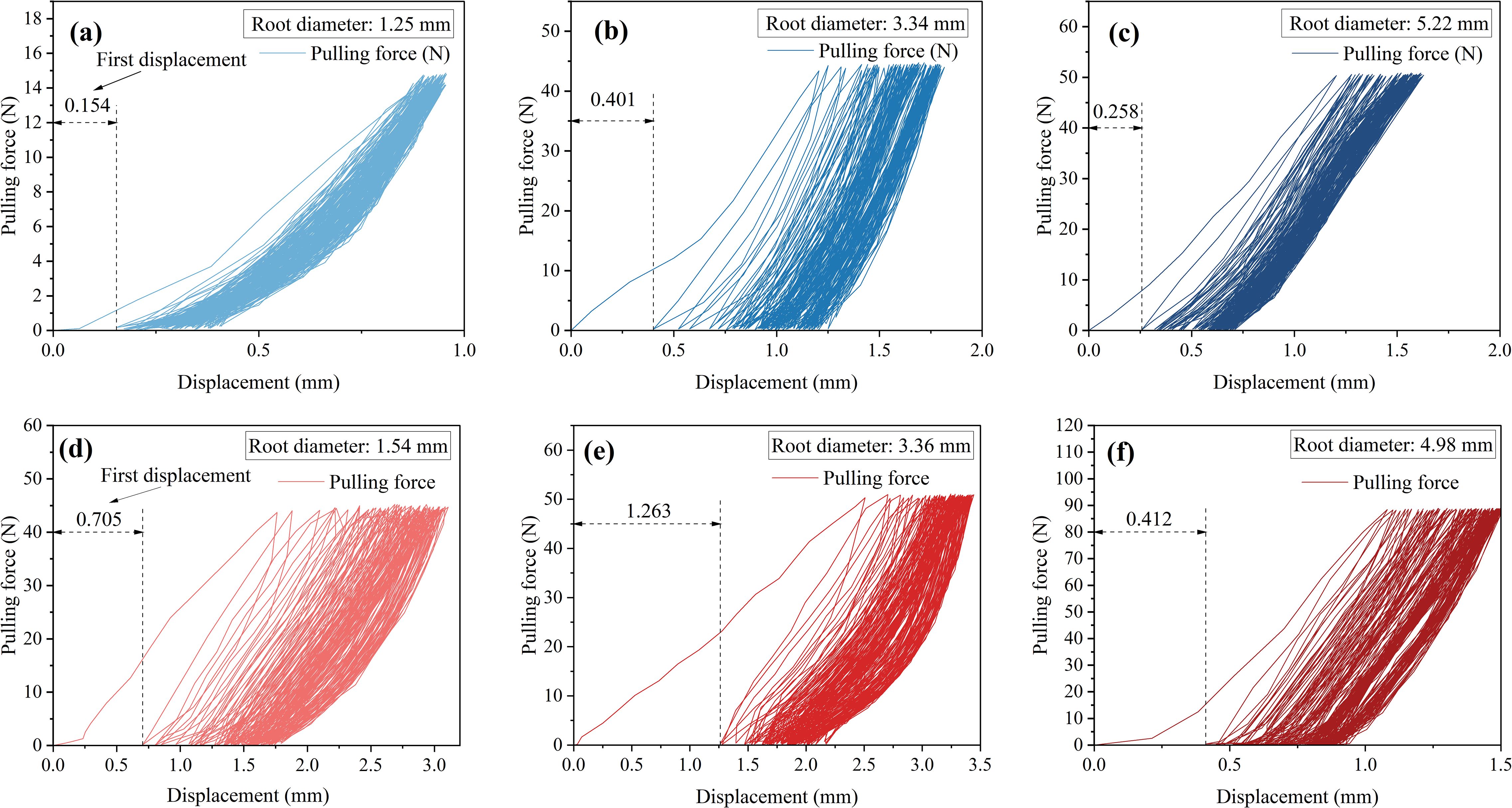 The initial displacement responses under a 75% cyclic load amplitude were 0.373 mm, 0.900 mm, and 0.874 mm, respectively, as shown in Figures 6a-c. By combining the initial displacement responses under 25% and 50% cyclic loads, It is evident that as the cyclic load amplitude increases, the initial displacement response also increases. However, at a cyclic load amplitude of 75%, the root system responds to the initial load in the same way as at low load amplitudes. As the number of cycles increases, two distinct situations arise. The first type occurs when the hysteresis loop width does not change significantly. As the number of cycles increases, the displacement increment does not approach 0 but remains largely unchanged, ultimately completing 100 cycles of loading, as shown in Figures 7a-c. The second type involves a gradual widening of the hysteresis loop width, ultimately resulting in some roots being pulled out before reaching 100 cycles of load, as shown in Figures 6d-f. After the cyclic loading ended, the residual displacement was observed to be positively correlated with the amplitude of the cyclic load, with larger amplitudes resulting in greater residual displacement.